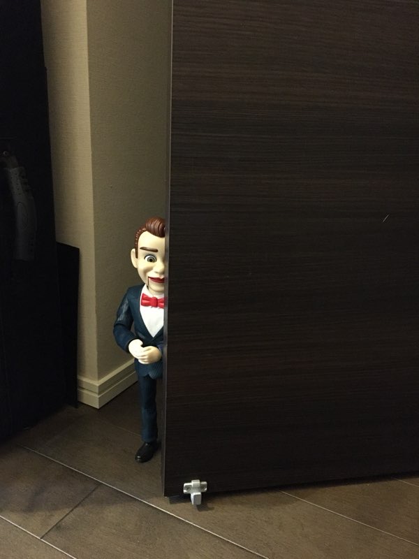 そのキャラがとても気になっていた ベンソン。 腹話術のお人形さん。 以前から腹話術のお人形さんってば お迎えしたいなぁと思ってはいたけど デカイから場所とるし、お値段もそれなりにするし っと諦めていたんですが で、おぉ! トイストに登場したのなら キャラドール出るよなぁって思ってて そしたら、当初、結構、良いお値段で これまた諦めてたんだけど かなりお値段下がってきたんで お迎えしましたぜ! (●´艸`)ムフフ いい感じ♪ 覗いてたりすると、雰囲気増すし♪ なにより、みもが怖がってるしね( ̄ー ̄)ニヤリ 口の腹話術のギミック。 動きます。 でも、ギミックを動かす場所が 後頭部で、o(´^`)o ウーン… 使いにくいなぁ。 これ背中とかだともっと遊べるのに。。。 ちょっと残念。 でも、ベンソン君、なかなかいい味で いっぱい遊べそう♪