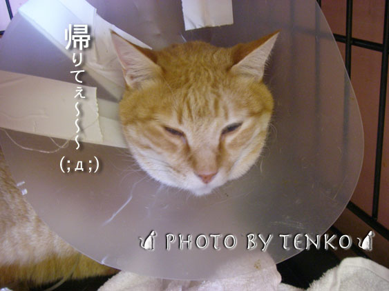 昨日みゆが帰ってきて、あじゅこと感動のご対面を期待していたんだけど<(;~▽~) それが、やっぱり、あじゅこはパラボラが怖いらしく。。。 「ハァ〜」って攻撃モード。 夜中に、一瞬、鼻を付き合わせて みゆだという事を確認したと思われたんだけど、 今も、みゆとは同じ部屋にいられない。 しかも、ご飯、食べないし。。。ミ(ノ;_ _)ノ=3 で、一方みゆの方も、帰ってきてから、 夜中までは、コツコツ、コツコツとパラボラを いろんな所にぶつけながら、 部屋の点検。 それが済んだ本日は、寝てばかり。。。 その夜中に、カリカリを20粒弱くらい食べて、 水を飲んだっきり、食べないし。。。。ミ(ノ;_ _)ノ=3 食べない二人が ストレスを抱えて、別々の部屋に籠ってしまってる。。。 大ジョブかな?? やっぱ、諸悪の根源は、パラボラだ。。。きっと。 これが取れれば、みゆもご飯食べられるようになるという気がするし、 あじゅこも、みゆだと確認できて、普段の生活に戻れるという気がするし。。 後、明日1日の我慢か。。。。 まあ、あじゅこは元気だから、食べなくても大丈夫だけど、 みゆ。。。。体力、落ちまくりだよぉ〜!!! しかし、猫も、嗅覚とかじゃなくて、 見た目なのね。。。(⌒o⌒;A どこの子も、パラボラした自分んちのお猫を見ると 最初は「ハァ〜」っていうみたいだもんねぇ〜。。。 でもね、夕べは、久しぶりに、 ベタぁ〜と寄り添って眠りました、みゆと♪ とにかく、今日は眠っているみゆ。 気づかれからかなぁ〜。。。。 それだけだといいんだけど。 パラボラおばけが怖くて、 ずっと、物の隙間から 様子を伺うあじゅこ それにしても、今日は風が強い。 今日、みゆの面会に行ってきたら、 「ご飯食べないんですよねぇ〜」と開口一番。 <(>o<)> 「性格的に、恐がりさんだからぁ。。。」 そうなのだ、みゆは、内弁慶なのだぁ〜〜!!!! と、宣言しても仕方が無い。。<(;~▽~) 争いを避けるタイプっていうか、 「私は貝になります」っていうタイプで、 先生も 「怒ったりとかそんな事はしなくて、むしろ大人しいんだけど。。。」 あじゅこの時は、 「あじゅちゃん、良く食べますねぇ〜」って 言われて。。。 恥ずかしかったけど、 (゜-゜)(。_。)ウン(゜-゜)(。_。)ウン 元気なんだねぇ〜って安心したけど。。。 で、お口に持っていってあげると ちょっとは食べてくれるということなんだけど。。。 私があげても食べんかったぞ。。。(◎`ε´◎)ブゥーー! で、このまま1週間、この調子だと 体力が落ちちゃうので、 明日、一時退院決定ぇ〜〜〜〜〜〜!!!! ちょっと、膀胱の方の傷口が塞がってるかどうか 明日、みてみて(そんなのわかるのかな??? じゃないと 体におしっこが出ちゃう。今は、管を直接通しておしっこを 出してるんだけどね)だいじょうぶそうなら、午後退院。 わぁ〜い!!!! 退院だぁ〜!!ヾ(@⌒▽⌒@)ノ って嬉しいんだけど、 パラボラはまだ取れない。。。 で、ちゃんと、膀胱の方の傷口が塞がってるって 保証はあるのかなぁ?????? ( ̄▽ ̄;) まあ、獣医さんにそこはおまかせするしかないか。。。 ってことで、明日、帰ってくるぜ!!!! その事は、ものすんごく嬉しいぃぃぃ!! で、帰ってきて、ご飯一杯食べてくれれば 良いのだけどなぁ〜。。。 やっぱ、phコントロールのカリカリ、 あんまり好きじゃなくなっちゃったのかなぁ?? と、いろいろと不安もあるけど、 まずは、明日、明日じゃ!!! |