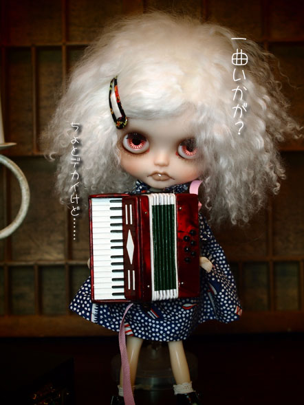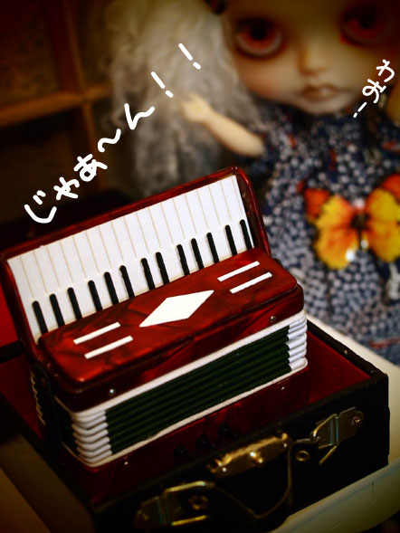 今回も、皆様の一杯の応援、ご入札 ありがとうございました(o*。_。)oペコッ ウィッグにあんなに入札していただき なんか、びっくり.+:。ヽ(*'0'*)ツ ワオォ!! ほんとに、ありがとうございました♪ おコメちゃんが、 「オソロだぁ〜」と 喜んでおります♡ で、 我が家にトイピアノが2つなかったら……。 絶対に絶対に、アコーデオンを買っていたんだけどなぁ。 ミニアコーデオンですら、やぱ、一辺20センチ以上はあって あんまりまた物を増やすと、部屋がごちゃごちゃに……。 っつか、もうごちゃごちゃになってるんだけど。 やぱ、トイピアノが2つあることで 鍵盤楽器はこれ以上増やすのは止めよう(+_+) と、踏みとどまっていた。 そうだ!! ドール用のを買えばいいんだぁ!!ワ─+。:.゚ヽ(*´∀`)ノ゚.:。+゚─イ♪ と、なんか、こうこじつけて ポチしました。 ちょっとブライスには大きめだけど でも、結構大きなアコーデオンってあるもんね。 だから、そういう雰囲気で♪ ミニョと一緒とか、いろんなシーンに ノスタルジックな印象を醸し出してくれそうだわん♪ しかし、ほんとによくできていて これで1600円以内とはびっくりだす! ケースも付いてるのよん。