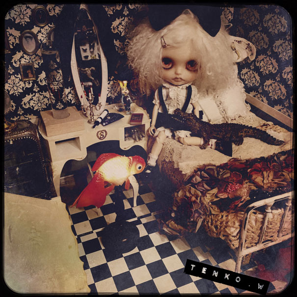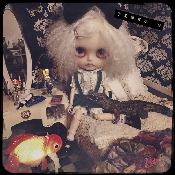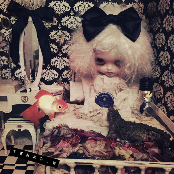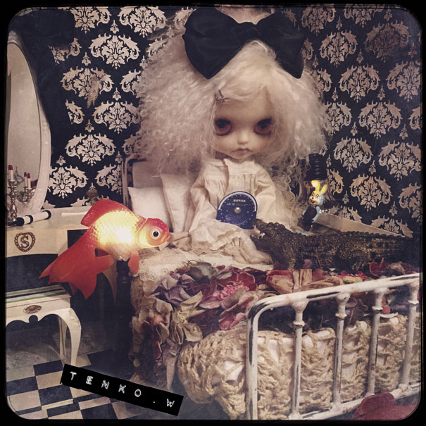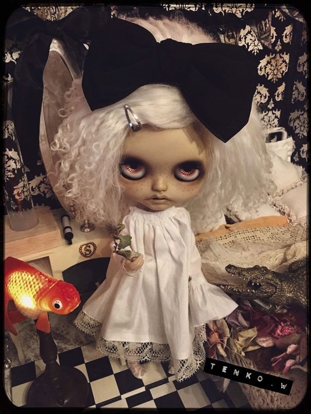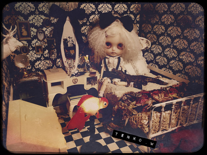 おコメちゃんは、しめじダンボールハウスで 暮らす事になりました。 おコメ「…( ̄。 ̄; )ブツブツ ダンボールかよ(*¬。¬) …ブツブツ」 でもね、ベッドは素敵だからね♪ それと、ドレッサーとライティングデスクも ご用意いたしましたから。 これ、ヴィンテージモノよぉ〜! おコメ「フーン (* ゚ω ゚*) …で?」 え? あ、鏡は紛失されてて、なかったから 他の鏡を取り付けさせていただきました(・ω・;)(;・ω・) 鏡の黒リボンが、まがまがしくて 良いでしょぉ?! (*´∀`*) おコメ「(´・ω・`) フーン」 金魚ライトもあるし ワニさんもいるしさぁ♪ しばらくはここでお願いします<(_ _)> おコメ「仕方ないだわさ」 で、お寝間着に着替えて、 星座早見版で今日の星座を 確かめるおコメちゃんでした。 なにはともあれ、おコメちゃんの 居場所を確保できて、 少しずつ通常の生活に戻っていきます。
