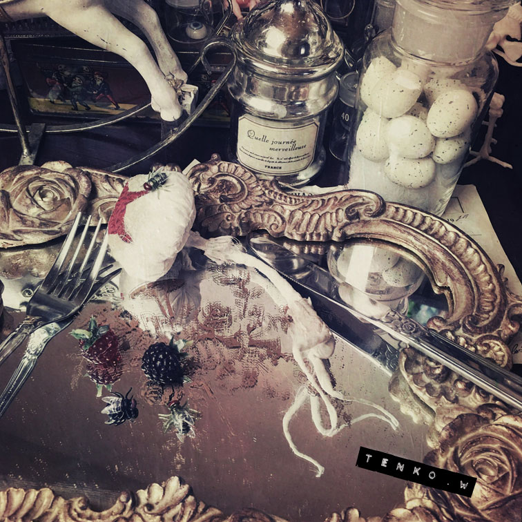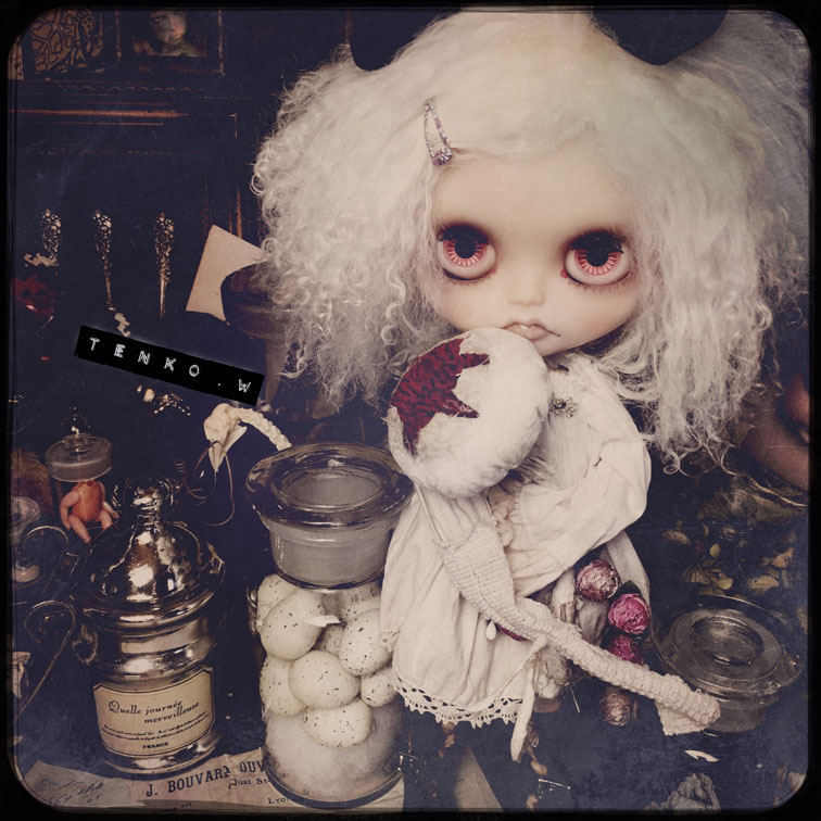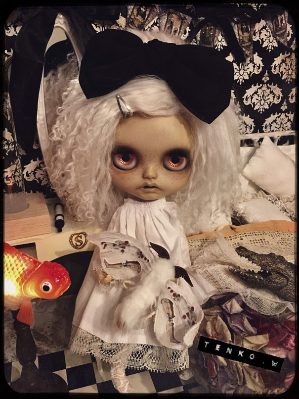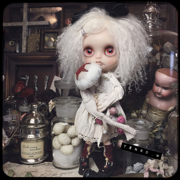 で、いつもおコメハウス、見て貰っておりましたが 売り物件という事で詳細をアップいたします。 サイズは横55センチ×奥行き41×高さ41センチです。 では、 まずは、全体像 そして、左手前隅っこから 少し小さいですが医療用の手洗い洗面器とか TENKO作のハットボックス。 歯型のチェアに座るアイボ。 テーブルの上には、おコメちゃん愛用の 天体望遠鏡。 タイプライター、などが。 左側の壁の窓も透けて外が見えます。 そして、左隅っこ。 地球儀や試験管立て、人体解剖模型。 チェストの引き出しは開閉できます。 フラスコにアイロンとか。 Abtujva rituferの種の標本。その下にはステルクララの森に住む妖精の クリスタル繭の標本とかね。 中央のテーブルには薬瓶とおじいちゃんから貰ったノート。 鉄製の鳥かご(底抜け)と獣の頭蓋骨。 正面には乙女らしくミラーもね。 その前の瓶には、スズランの布花とか。 あ、チェストの前には額縁も何個か重ねて置いてあります。 正面の窓も外が見えます。 チェストの上の人体図と蜘蛛の構造図、それから ハンティングトロフィーは粘着力の弱い 両面テープで貼ってありますので お届けの時は剥がしての梱包になります。 そして、金魚のルームライト。 向かって奥の棚の上には、右から テンコ作のプレート、きのこのスノードーム。 王冠のとれかかった骸骨(顎がガクガク動きます) クラゲの標本(もちろん作り物だけど(笑)) あ、このクラゲの標本は、 普通は、 なんだかよく見えないけれど ブラックライトをあてたり 明かりに透かしたりするとその姿を確認する事ができます。 右の棚は開閉ができ。 上から こんな感じで色々と詰まってます。 ↑なんかは、ネズミの子供のホルマリン漬けみたいなモノでして<(;~▽~) もちろん、作り物ですが。 もしも、苦手な物があったら、捨ててください(^_^;A アイボとてんこ作のナタリーレテの猫のクッション。 これが中身です。 さて、次は、お部屋の構造の方へ。 左の壁と正面の壁は蝶番で繋がっています。 右の壁は自由にできるように固定はしてありません。 全面の壁が床とは固定してありません。 なので、しまっておく時や輸送は ペッチャンコにできます。 床はいつものフローリングとパンチ絨毯の リバーシブル。 正面の壁 左の壁 右のドアのある壁。 ドアですが、おじいちゃんの古いおうちを リメイクして。。。という設定であるというのが 理由というのでもないのですが 向かって右側の戸の開閉がちょいとキツイです。 ご了承ください。 で、固定していないので、組み合わせで色んな 遊び方ができます。 上の画像のドアのある壁の後ろに 閉じた正面と右の壁を置くと こんな感じで、こんにちはぁ〜! ができます。 こんな配置にすると 廃墟感が出るしね♥️ 何故寝転ぶおコメちゃん(笑) だいたいおおまかですが おコメハウスの全貌です。 金額は¥200,000ーを予定しております。 ちょいとかわいくないお値段ですが おコメちゃんとの思い出も詰まってるし おコメちゃんと集めたいろんなモノも入ってるし ちょいとダメモトな感じのお値段ですが もしも、もしもな方がいらっしゃいましたら 初日から4月12日(木)まで こちらのブログから応募フォームへの リンクを貼りますので、 そちらの方へ飛んで頂いて、 ご応募、よろしくお願いいたします。 ギャラリーへ直接いらしてくださる方は その期間、ギャラリーに応募用紙が置いてありますので ご記入ください。 16日(月)に当選された方のみに ご連絡をさしあげます。 ではでは、長々とおつきあいくださって ありがとうございます! |