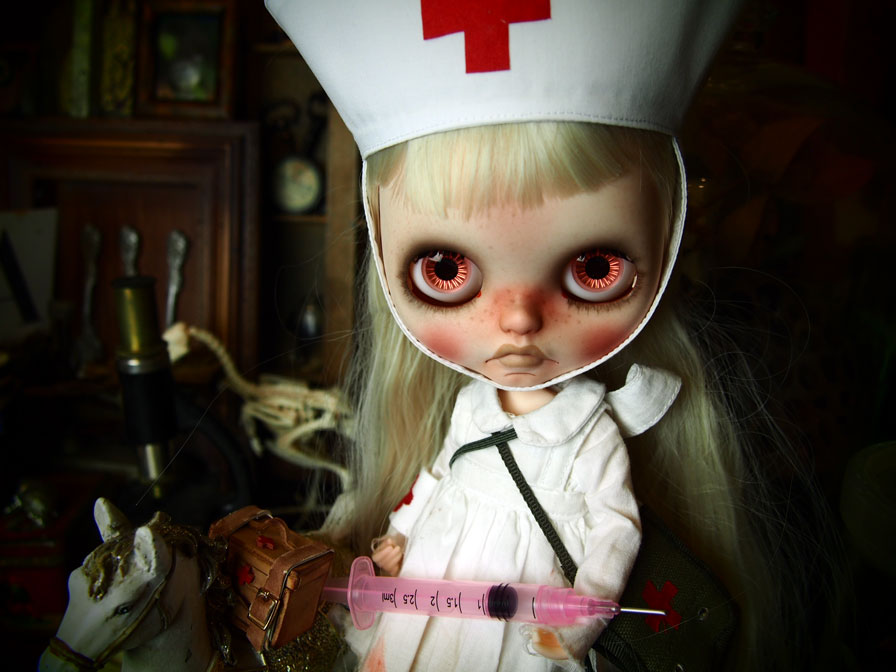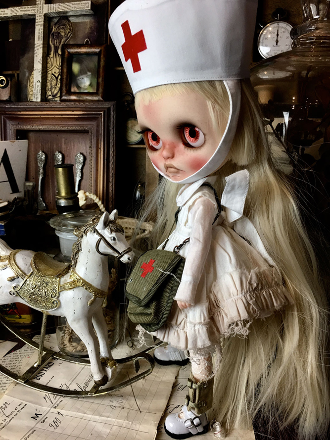 「木馬に乗ったナース*Limra」 横からのシルエットもかわいい♪ 地獄少女の閻魔愛ちゃんをパクって 「いっぺん、注射してみる?……」 と、ヤフオクの説明文にも書いてしまいそうになった(笑) そして、血の付いた脱脂綿をピンセットでつかむ画像は なんか、お弁当を食べているようで おちゃめだったり.: *:( *´艸`).:゚+ いやいや、Limraは木馬に乗って野戦病院を巡りながら 反戦を叫んでいるナースなのだ! ヤフオクページは こちら 今週土曜日9日、夜11時過ぎに終了です。 よろしくお願いいたします<(_ _)> |