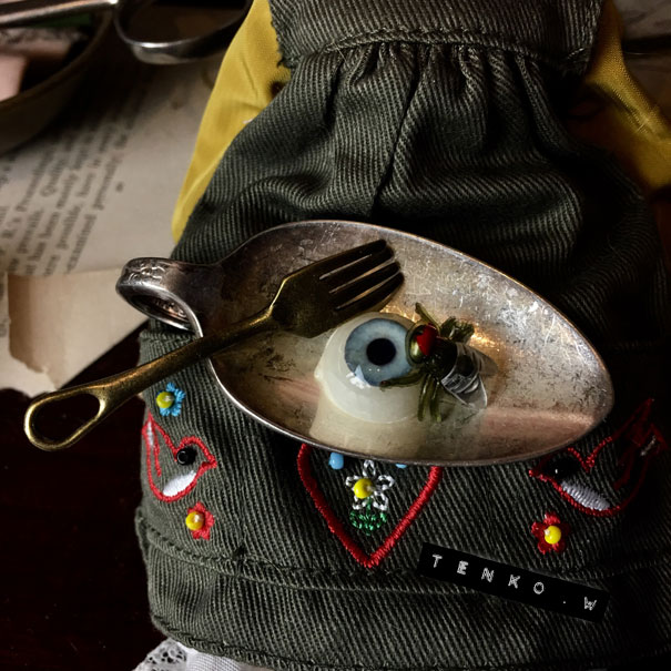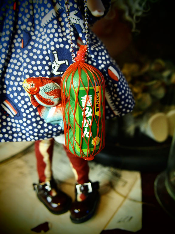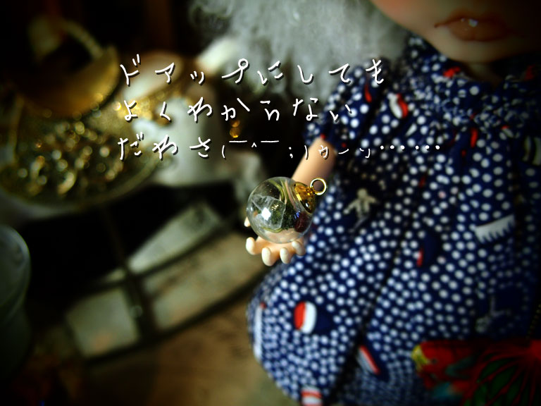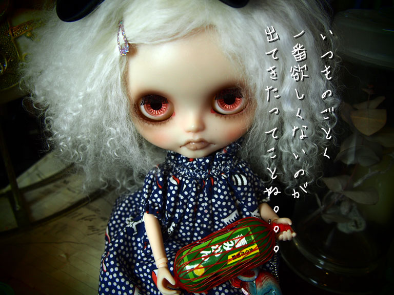 お、おコメちゃん なんかすごい淀んでますけど(;´ー`)┌ おコメ「当たり前でしょ。最近、ちーとも出番なくてさ。 ブツブツ…( ̄ε ̄;[壁]」 (;´▽`A`` ご、ごめんねぇ。個展のための製作が...ρ(´ε`*) …イジイジ… だもんで、この前、吉祥寺行った時 みかん買ってきてあげたじゃん! おコメ「これっすか?」 そうそう!! それに、ドームに閉じ込めたハエも 作ってあげたじゃん! おコメ「これっすか?」 そうそう! プレゼント、プレゼント! おコメ「てかさ、ドームハエ。これ、穴から 入らなくて、ドーム割れてるし…… ギュウギュウで、なんか全然ワケワカナ!」 (;´▽`A`` あ、入ると思ったんだけどねぇ。 入らなかったね、ハエさん。(^_^;A おコメ「考えてから買いなさいよ。それから みかん、これ『青みかん』じゃん。 まだ、食べられないじゃん。」 あ、いや、青いみかんでも美味しいよ! きっと、多分。。。 それにさ、時間が経てば、熟すじゃん! おコメ「あのさぁ、ドール界には、『熟す』とか マジ、ないっすから(~_~;」 ………あ、そ、そうだったね、そうだよね。。。 (;^ω^) えっとね、これ「ぷにっと! みかんマスコット2」 っていうガチャでね、 他に、冷凍みかん、おいしいみかん、黄金みかん、腐ったみかん があって、全5種なの。 熟し方とか冷凍とかでやわらかさが違うんだよ。 おコメ「これ全然、ぷにっとしてないじゃん!」 だってね、「青みかん」だから固いのさ(*´σー`) ヘヘ… おコメ「『ヘヘ』じゃなくて…( ̄。 ̄; )ブツブツ」 でも、「腐ったみかん」じゃなくて良かったでしょ? おコメ「いやぁ、むしろネタ的にはそっちの方が 良かったんじゃないのぉ?」 う、うん。 そ、そうなんだよねぇ<(;~▽~) (;´д`)トホホ… そ、やっぱ、ガチャってば 一番、出て欲しくないなってのが 出る。。。 哀しいサガなのでした。 久しぶりにおコメちゃんと 遊んだら、マジ突っ込まれてばっかりだった(;´ー`)┌ それでも、やっぱり、お人形遊びは楽しい!!!