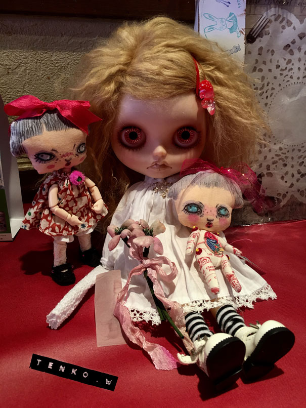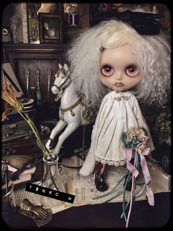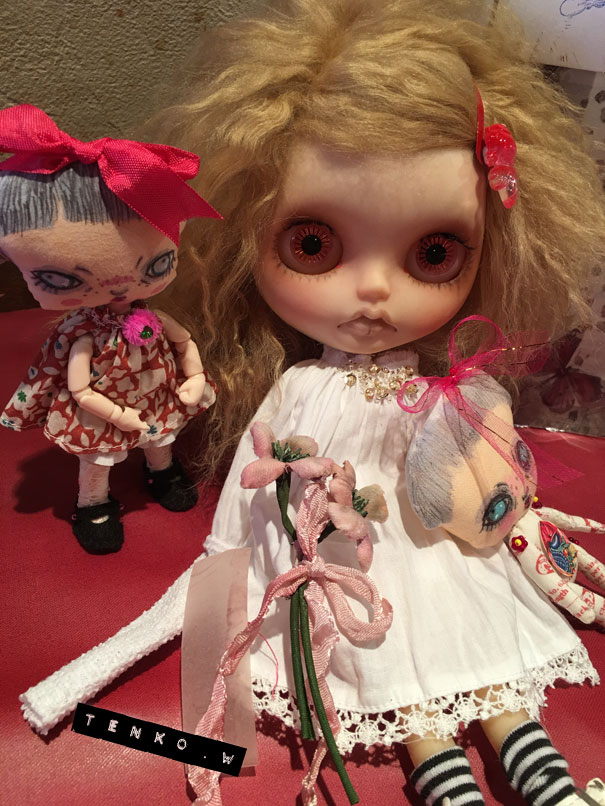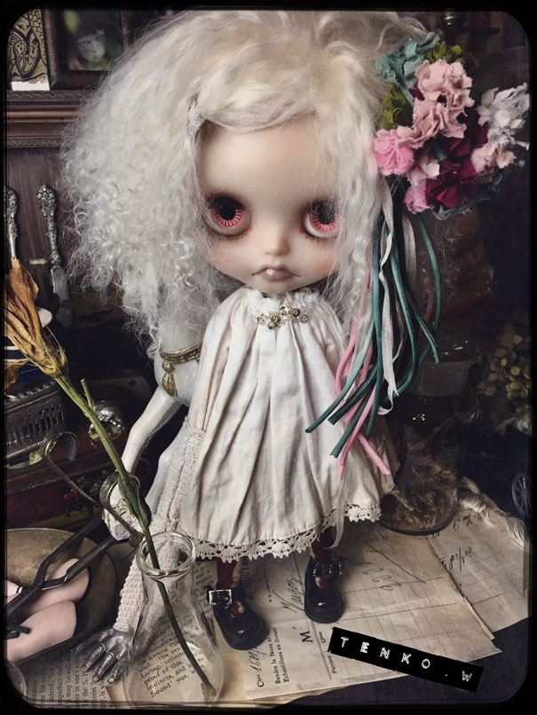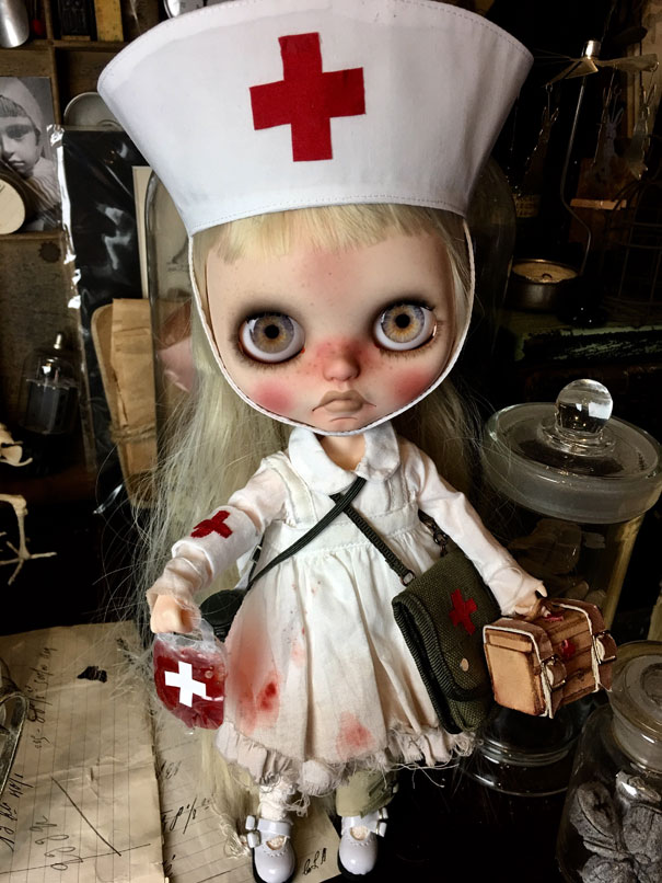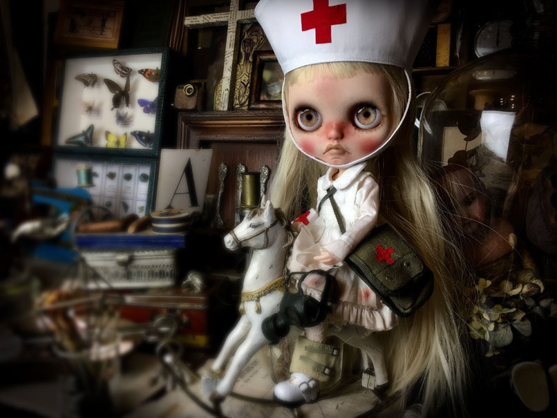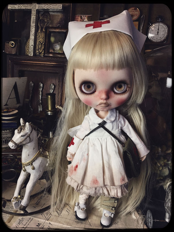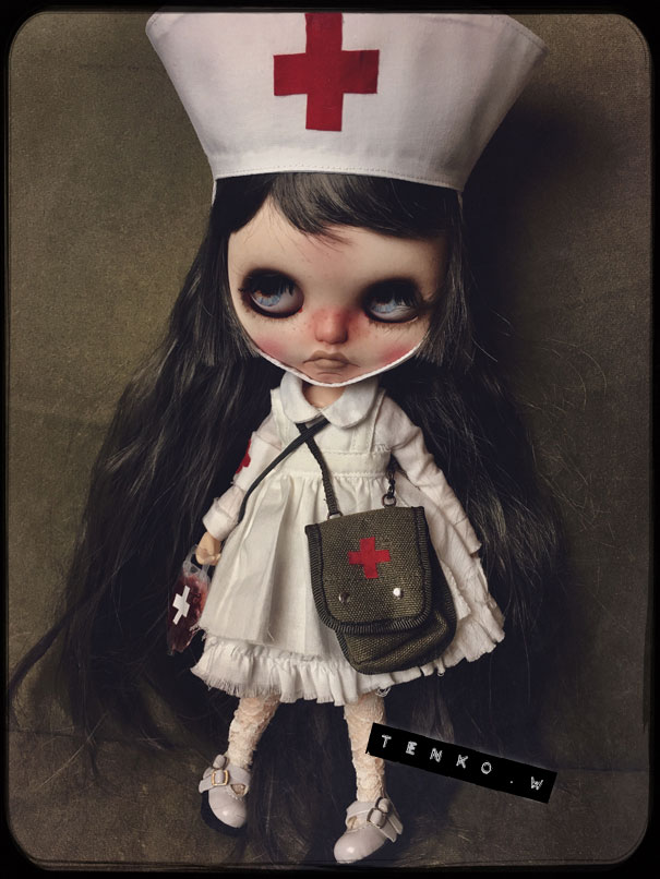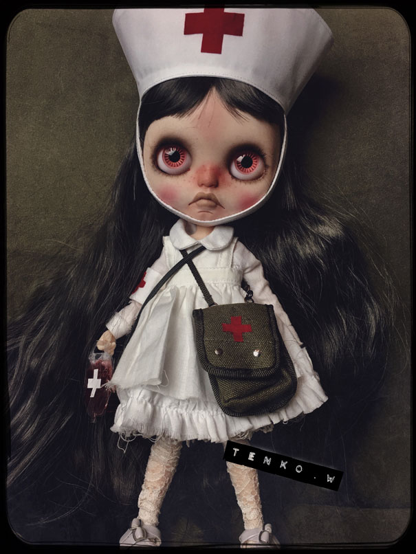 この前の投稿では、ダークグレーのヘアでしたが 色々と迷って ブロンドヘアに変更。 そして、お鼻の色も少し薄くしました。 接近してると大丈夫なんだけど ひいて撮ると光の加減で鼻が長く 見えちゃうので( ̄▽ ̄;) で、「木馬に乗ったナース」です.: *:( *´艸`).:゚+ お肌の感じ。 今回のこの感じ、すごく自己満足.: *:( *´艸`).:゚+ そして、小物もちょいと紹介。 救急箱と輸血用の血(随分雑な作りですが、 そこがグロっぽくていい?とこれも自己満足(笑)) 持ってます♪ 救急箱は開けると 色々と入ってて、小さい包帯は救急箱の中 大きな包帯とカプセル。 あと、ガスマスク。 そんなモノたちが付属します。 あ、救急箱は残念ながら私作ではないのですが 色々とリメイクはしてあります。 そして、あ、そだ。 普通のナース帽も作ったので これも、おまけに付いちゃったりします。 OFも汚しかけました。 エプロンにはちょいと体液と血糊。 でも、ワンピは紅いの付いてないので 普段着として使っていただけるかと♪ さて、明日明後日で撮影&出品業務して 水曜日には出品です!!! PR