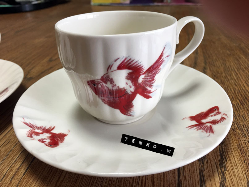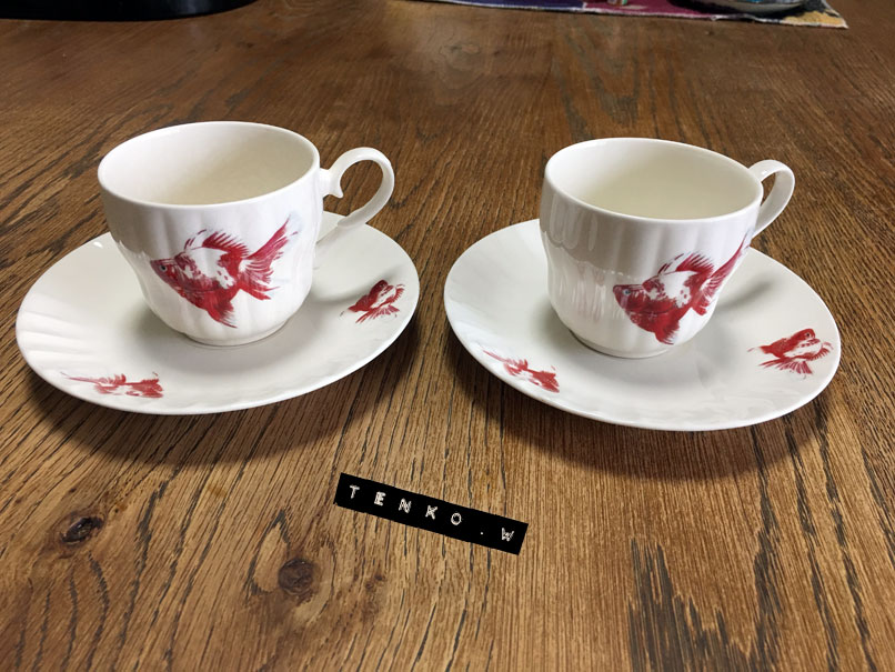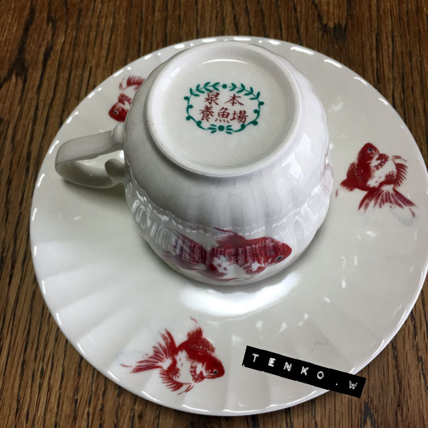 jちゃんから、 「渡したいモノがある!」 って事で、急遽決まったデート。 Facebookの「過去のこの日」を見ると ちょうど昨年の今日も、jちゃんとデートしてた.: *:( *´艸`).:゚+ 場所は立川! ほとんど同じような場所じゃんゞ(≧ε≦o)ぷぷっ!! で、ランチ。 ショップでお買い上げしてくれた 萌え袖ワンピにさっそく着替えて 布ドールたちとパチリ。 でね、「渡したいモノ」って なんだろなって? 白い布をわけてくれるってのは 前から聞いてたけど それとはまた別に「ブツ」があるらしい。。。。 なんだろなぁ?? って、思ったら、な、な、なんと、 金魚のカップ&ソーサー。 覚えてらっしゃるかしら? 先月の下北沢のバブーシュカさんでの 布花ワァクの時の、おやつの時間の カップ&ソーサー。 金魚の紅茶カップだったでしょぉ?! なんと、なんと、金魚のカップぅ〜〜〜!! ヤフオクで6脚、ゲットしたからって 2脚、分けていただいちゃったぁワーイ♪ゝ(▽`*ゝ)(ノ*´▽)ノ ワーイ♪ これはコーヒーカップだけど もう、かわいからさ、何カップでも いいのさ!!! 裏を見ると、 「泉本養魚場」 とある。 どうやら、大阪にそういう名前の養魚場があるにはあるんだけど そこが販売したモノなのか、故事来歴は 定かではないけど バブさんにあった紅茶のカップ&ソーサーの 金魚とまさしく同じ!!! 今度、バブさんへ行ったら、裏に 泉本養魚場と書いてあるか 聞いてみよう! jちゃん!!! m(*>▽<*)m アリガトッ で、今日は台風で逢えないかと思ってたら 雨上がりてんこの面目躍如。 台風どころか、めっちゃ暑い日になってしまた(;´▽`A`` 被害にあわれた方には申し訳ないですが 今回は、台風も回避してしまった 雨上がりてんこでありました。