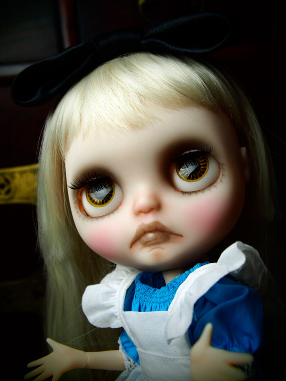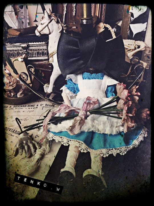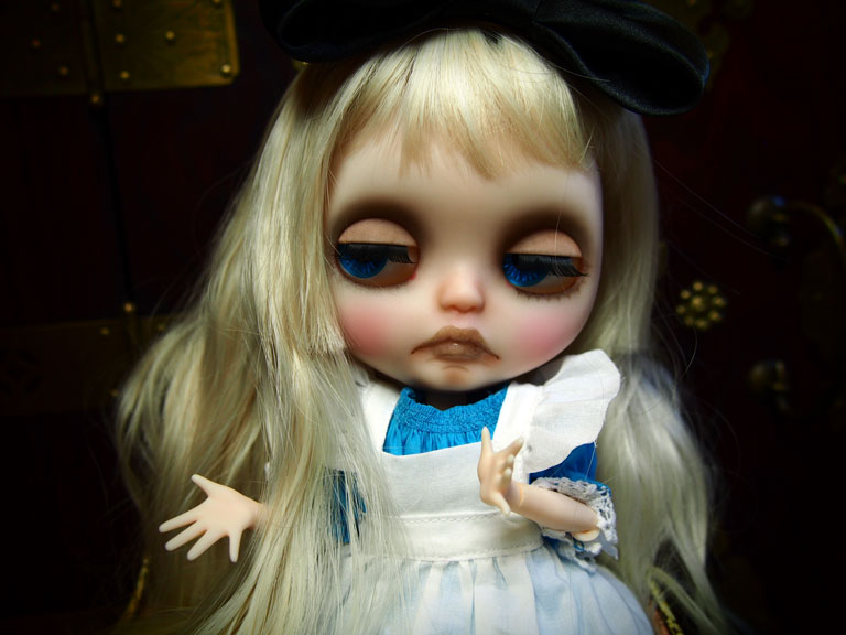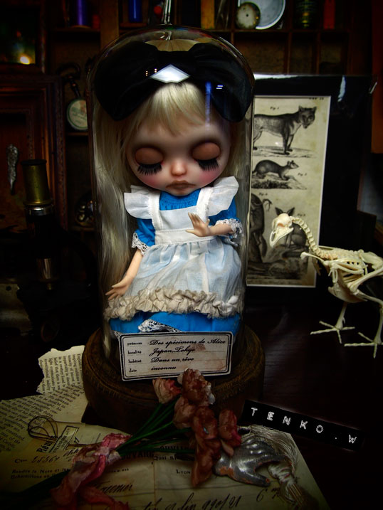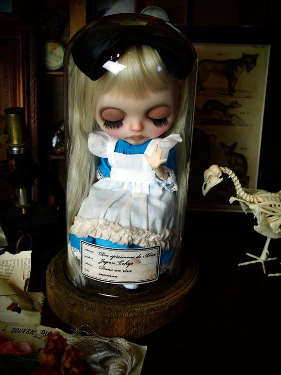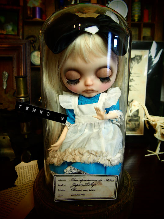 以前、KENTO氏の蒐集箱ってな題名で ディスプレイボックス付きで出品したブリジット、覚えてらっしゃいまする? 「KENTO氏の蒐集箱」←こちら その続編って事で、 あの、小さな扉の向こうへ吸い込まれて行ってしまった KENTO氏の部屋には、まだ、彼の蒐集物があって、 今回はその中のまた一つ。 「アリスの標本」 を、売りに出すという設定なの。 KENTO氏が自分の「夢」の中で 捕まえたというアリスを ガラスドームの中に、標本にしていた。 そのガラスドームを売りに出して 中のアリスを目覚めさせて♪ っていう、そんなシチュエーションです。 嗚呼!! こうやって標本化されてるのって なんでこうも、ソソラレルのかしら┣¨キ(*゚д゚*)┣¨キ たまらぁ〜ん!! まだラベル貼ってないけど ラベル、貼らないでおこうかなぁ。 お好みで貼ってもらうとか。 ( ̄^ ̄;)ウーン でも、やっぱり貼っておいた方がそれらしい? ま、もちょっと考えて、 来週、水曜日には出品したいです。 今回、着手してから、すんごい短時間で 仕上げたって感じ♪ めちゃくちゃ、集中してたよ、自分。 やぱ久々で、カスタムがやりてぇ〜〜〜って 体の奥の方で、ウズウズしてたのかしらね(*´艸`) ムフ♪ さてと、次は撮影だね! |