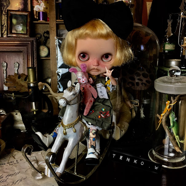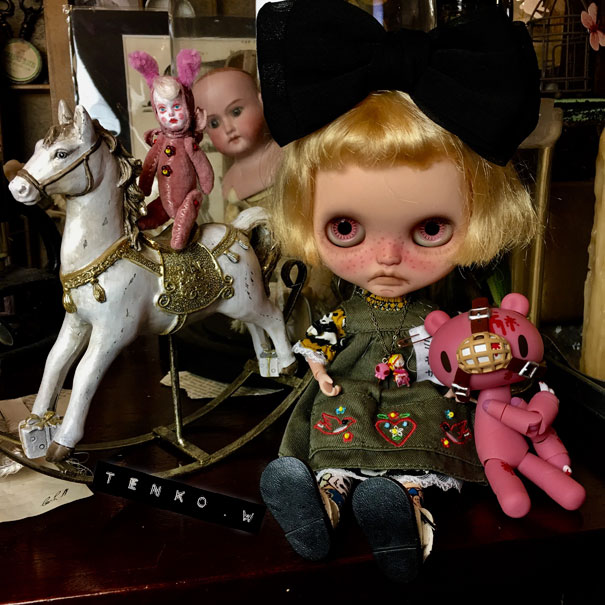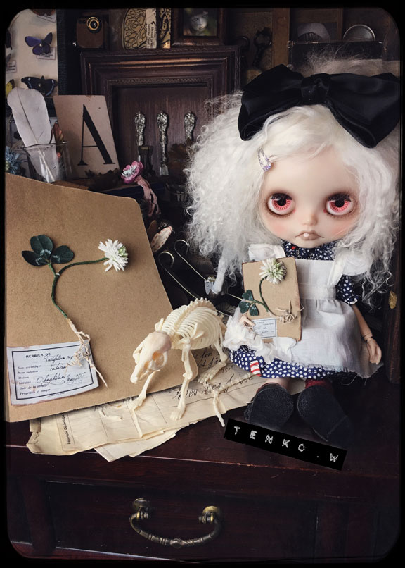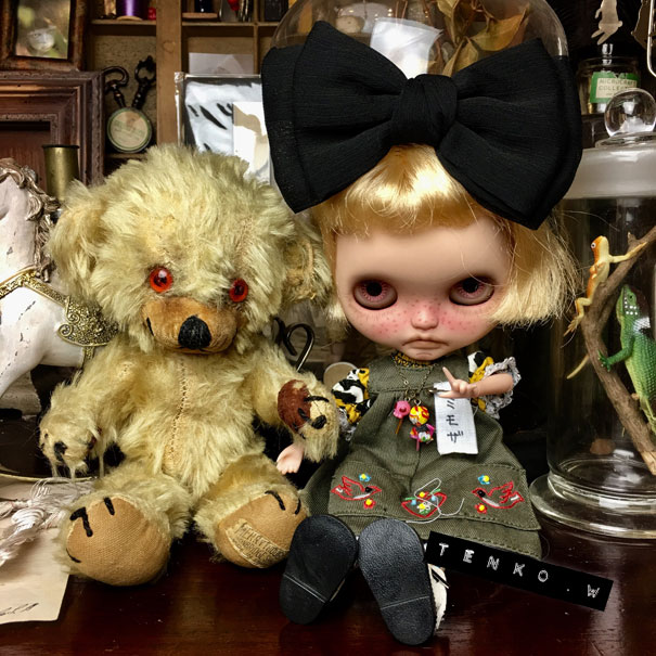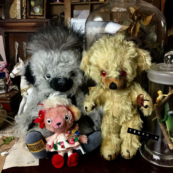 探してて。 ebayやらヤフオクやら、もちろんショップなどなど。 でも、大きさとか、お値段とかで なかなか、これ! という子が 見つからず、お迎えに至ってませんでした。 が、Mに教えてもらったアンティークショップ。 インスタでフォローさせて貰ってて 先日、「本日は○○をアップする予定でしたが、 予定を変更してショップにこの子アップしました」って その画像を見て、電流が走ったね!(笑) 「私が求めてた、チーキーだ!!!」 っと、ショップへ行くと ちょいと難アリで(お耳が破れてる。手足のフェルトが破れてる。目にスレがある。) お値段もかわいいお値段じゃん! って事でお迎えに至りました。 Mには、すんごい感謝、感謝だわん.:゚+(u_u*).:ポッ+ チーキーらしいヤンチャなお顔がカワイイ—゚.+:。ヾ(≧▽≦)ノ゙☆゚・*:。.:—ッ!! 以前から、いる、チルターンのハグミーベアの「クマさん」と ご挨拶。 「こんにちは」 二人のサイズ感も(゚∇^d) グッ!! そして、ヴィンテージじゃないパンキッシュチーキーと 海外の作家さんがチーキーにインスパイアされて 作られている、ピンクチーキーと一緒に♪ ブライスとのサイズ感も、さらに.:゚+☆⌒(*^ー゚)b グッ!! お腹の中の鈴もまだちゃんと、チロチロ鳴るの♪ 難アリ子だけど、またその方が 我家にはピッタリで、大満足なチーキーが お迎えできて、嬉しい!!! それと、布花標本にアンティークっぽいスミレが 加わりました。 これでドールサイズの布花標本は5種類。 今日は、流れでミモちゃんが紹介。 なんかね、自分で作ったモノだけど このサイズの布花標本、見てると (//艸//) …ムフ♪ って、なるのです。 なんかね、(*´艸`) ムフ♪ってね。 さて、いよいよ、本番、日曜日です! がんばるぜい!!