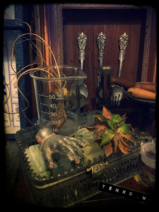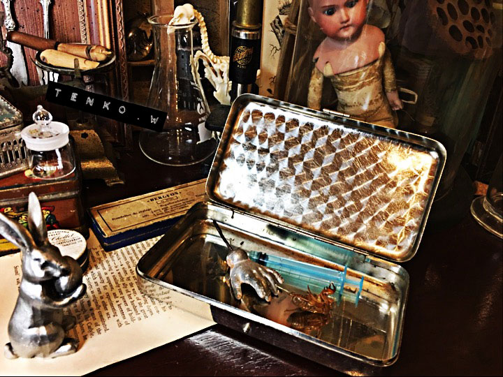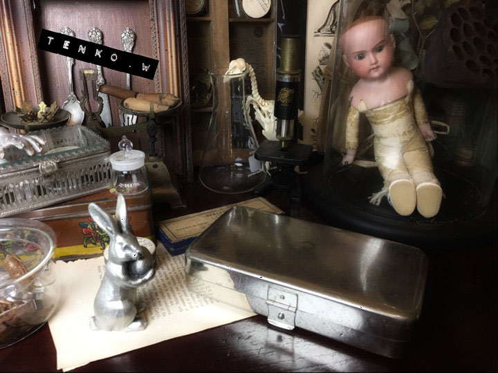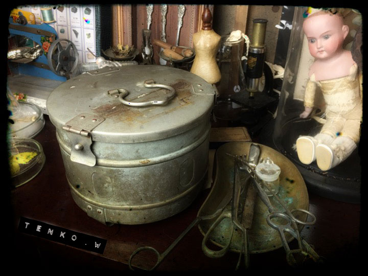 お里帰りの際に ちょいと遠出して 築100年以上の校舎をリノベーションしたお店 「海猫」さんへ行った際に シャメしてくれて、ゲットしたモノが やっとこさうちへ来てくれた。 (なかなか逢う機会がなかったもんだからさぁ) アンティークの医療用ガーゼ入れと 空豆皿(これそういう名前じゃないかも(笑)) 医療用ガーゼ入れは 実物見て、「こんな大きかったんだ(;´▽`A``」 って思ったけど、今は 染めに使って余った「液」を瓶に入れて それをここに待機させてある。 なんか、瓶に入れた「染色液」、色が付いてたりするし 「細菌」でも培養しているような ワクワク気分だったり。 空豆皿はいい加減に緑青がかってって 手術道具を入れるといい感じに.: *:( *´艸`).:゚+ そして、jちゃんがチョイスしてプレゼントしてくれた 銀のケース。 お弁当箱型のは持ってたんだけど こうやって蓋が固定されているの。 これはポイント高いよね♪ 一気にアンティーク医療系が増えて ニシシシシ( ̄ー+ ̄)。。。 と、木曜日にバブーシュカさんに行った時には WSだけじゃなくて、ちょいとお買い物も。 昔のポーズ人形のおてて←自分、何に使うのかはまだ不明(笑) とか、布花作りにかかせないペップとか(金魚さんチョイス)。 このペップセット。色遣いのかわいさに 袋づめのまま、眺めていたいほどΣ(●・`ω・)b Good!! とか、金魚バッヂとか小さい指輪とか。 そんなモノたちも連れ帰ってきました。 嗚呼、好きなモノに囲まれて暮らす部屋。 ごちゃごちゃだけど、 落ち着くし、幸せ.:゚+はぁぁ…(*´▽`人 ウットリ.: *:・