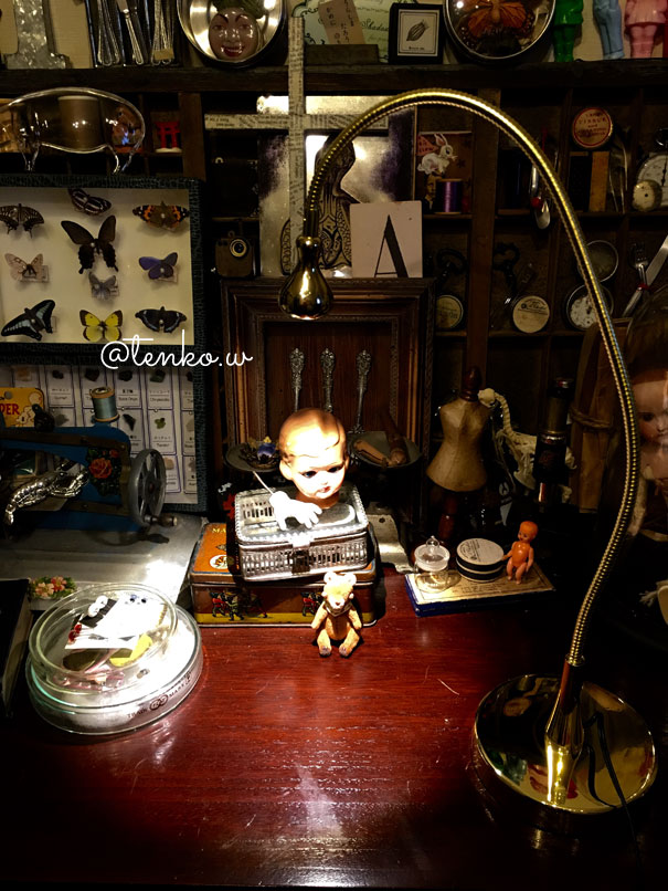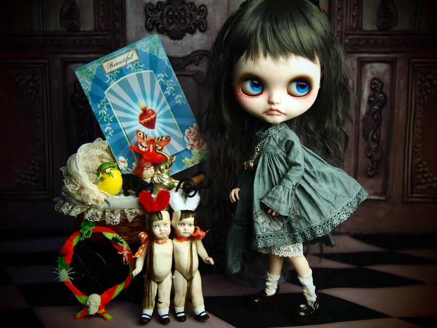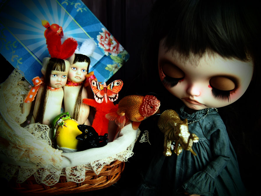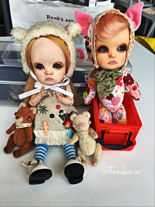 作ってます。 まずは、蝶の標本。 これまた、自分で作った、人間サイズのなんちゃって標本と比べると こんなサイズ感です。 蝶の貼付けも、ベッタリと貼るんじゃなくて あくまで、ピンで止めてあるってーのを 再現したかったので、ちょっと時間がかかってしもた。 画像だとよくわかんないかしら(;´▽`A`` ブライス持ったら、こんな感じ。 なかなかいい感じ。 そして、もう一つのアイテムは シャム双子。 今回は、このチビチビドールをシャム双子に改造しました。 これまた、画像だと、ただ二人並んでる だけのようですが。。。(;^ω^) でも、くっついてるの♪ 少しずつ、アイテム、揃えていきます。 今回はディスボックスをまた作るので 一つずつ、作っていったりして 合体させる時の高揚感、楽しみです。 .+:。ワクワク.:゚+(((o(^。^*)o))).:゚+ドキドキ♪.+:。 *******拍手コメへのお返事******* 一******ちゃん mのつぶやきで「初吉祥寺」って 書いてあったから、多分♪って思ってて せりんちゃんとも 「一絵ちゃん、来たんだね〜」 「来たんだよぉ〜」 って、話してたよん。 ほんと、やぱ、生は違うよねぇ〜!!!! 平面作品だけど、ちょっと切り込みとか入れてあったりして 見た時に、目眩感があるのは、そのせいなんだって わかって.: *:( *´艸`).:゚+ 塗りの厚みとか、自分が実際にその作品の前に立った感とか ほんと、ずっと見て、その空間に 見を置いていたかったよねぇ〜!