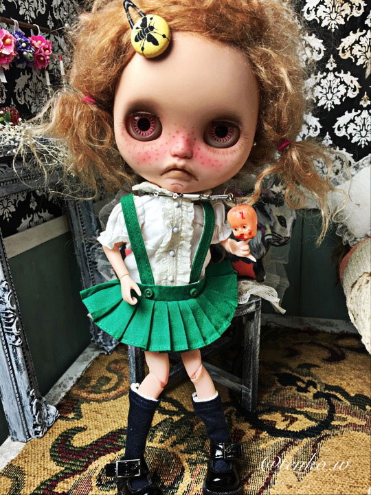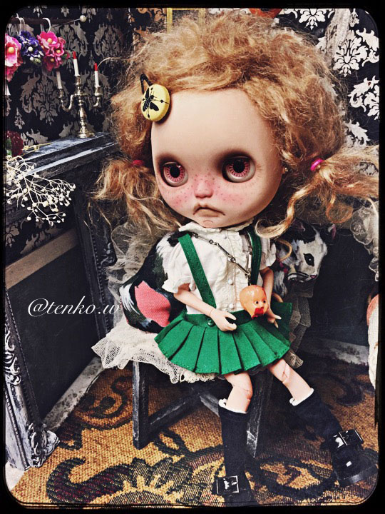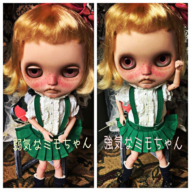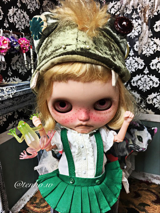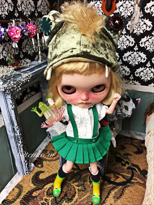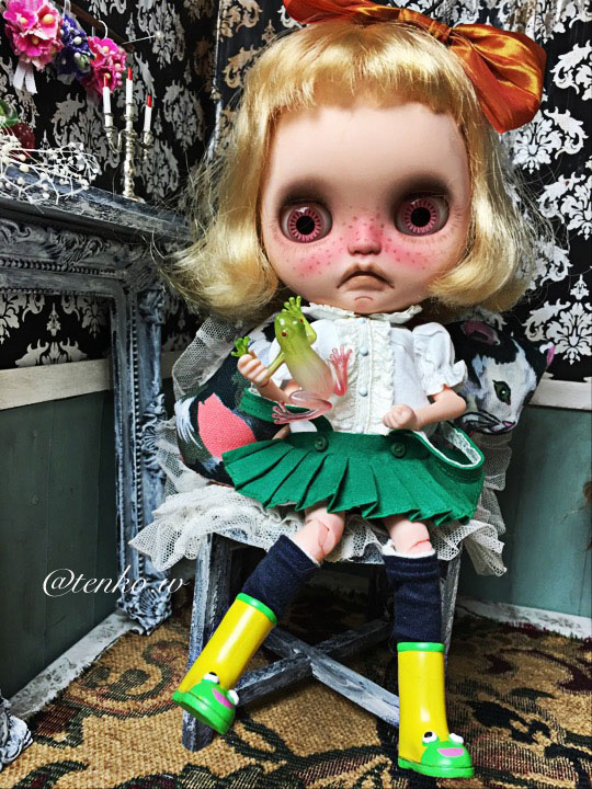 ミモちゃん。 カエルになりました。 ゲロゲェ〜ロ! おはぎ谷沢(おはぎダニザワ。ヤザワではありません(;´▽`A``)で スケルトンカエルを捕獲。 長靴もカエルだぜぇ〜! 「ケロケロぉ!」とかかわいい感じじゃなくて 「ゲロゲェロ〜〜!」な鳴き方pupu (* ´>艸<)・:∴ なんか、ちょっと今日は凶暴なミモちゃん。 まさか、生のまま、食するわけじゃないよね、ミモちゃん(;´ー`)┌ 時々、凶暴にもなるけど 案外に、弱気な部分もある、ミモちゃん。 名前は、「ミモザ」。 通称「ミモちゃん」 よろしくです。 やっぱり、XSボディの幼い感じの方がミモには 似合ってるので、抜けやすい、足首の軸に 接着剤をグルリと薄く塗って、太くして 抜け難くしました♪ ピュアニーモのSボディには履けない、リメのカエル長靴も 履けて、ご満悦!