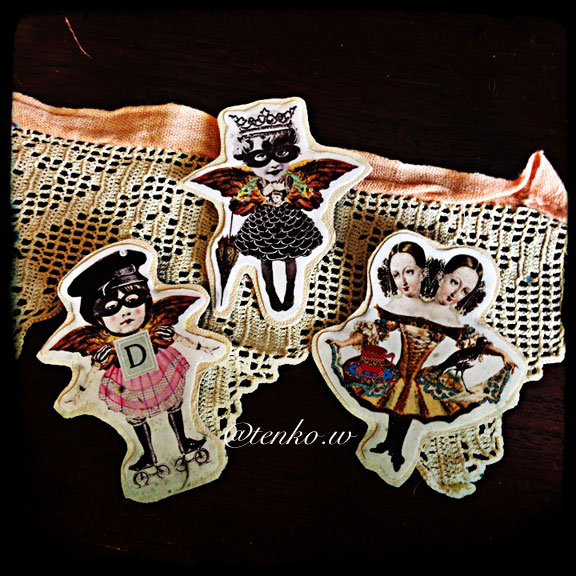 やってもやっても「わんこそば」の テープ起こし。 ほんとに辛かった(⑉꒦ິ^꒦ິ⑉) でも、今度こそ、今度こそ、終わりだとオモウ。 入ってきても1時間半くらいの長さのだから 今回の「わんこそばテープ起こし」に比べれば ベビースターラーメンくらいな感じだろうから❤️ で、やっと、今日余裕ができて 久々にコラージュして それ、レジンで固めたり プリントして壁に貼ったりと ひっさびさに自分の事して 遊んだ。。。。(ノω≦。)…ジーン… やっぱり、お人形遊びとか、物造るのって ほんとに、ほんとに楽しいねぇ〜。 テープ起こしは材料はほとんど要らないけど 辛いや、やぱ(-.-)ボソッ… まずは、プリントして壁に貼ってみた。 もうちょっと、バランスとか考えたかったんだけど 左肩が治ったと思ったら、右肩がフローズンショルダーで(*´Д⊂ グスン… 痛くてさ、とりあえず、貼ったっつな感じで お世辞にも素敵な配置じゃないんだけど(笑) でもって、レジンで固めてブローチに♪ それから、いつものお花畑ブローチも真ん中に ビスクの顔を配置してみたんだけど なんだか、「遺影」みたいになった感があって これはナイかなってな(笑) コラージュも楽しかったしねぇ。 部品集めは地道な作業だけど こうやって形になると、なんだか嬉しい.: *:( *´艸`).:゚+ それから、ティー子、おコメちゃんと同じ羊毛ウィッグしてみたら なんか、すごく乙女.:゚+(u_u*).:ポッ+ おコメちゃんはストレートウィッグだと乙女になるのに ティー子は逆なのね。 さて、今週からは、遊べるといいなぁ。。。 ┣¨キ(*゚д゚*)┣¨キ |