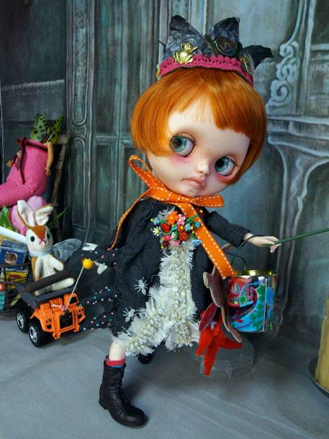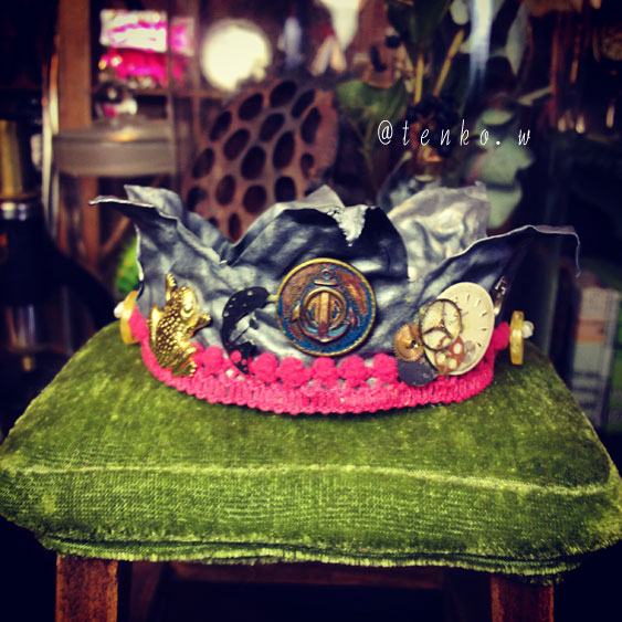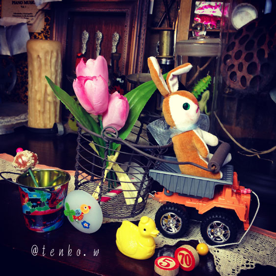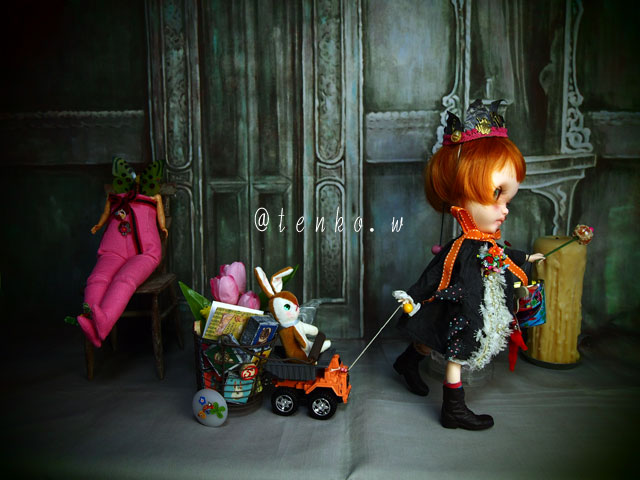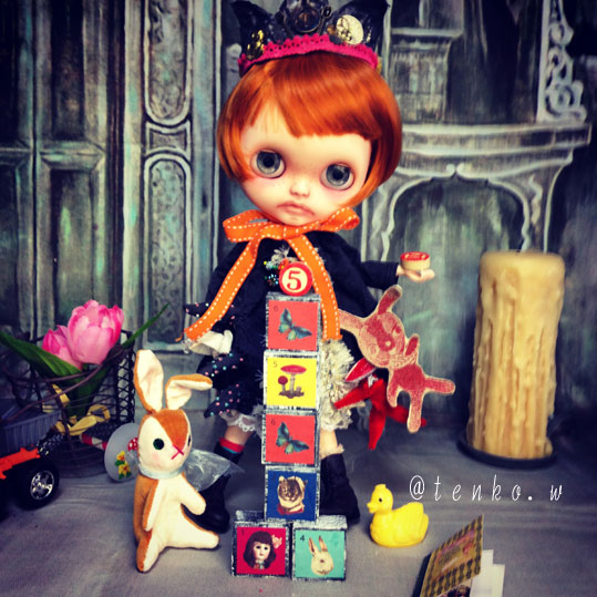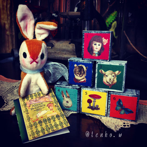 付属品も、着々とできつつあります。 ビロードのうさぎと、うさぎの絵本、そして、積み木。 ビロードのうさぎの絵本の表紙です。 かなりの感じで再現できたかなと、自己満足(笑) いや、でも、やっぱり、全然違うなぁ。。とか。(_ _,)/ それでも、裁縫得意じゃないのに、この大きさで ビロードのうさぎできたのは、自分で自分を褒めてあげたい!!pupu (* ´>艸<)・:∴ しかし、もうしばらくは、作りたくない大きさです。 積み木は数字も付けてあるので、ミニゲームができます。 どんなゲームかって? ま、それは手にされた方には説明書が付きますので(笑) って、まあ、大したゲームじゃなくて、数字隣合わせ的なヤツっすから(;´▽`A`` そして、 ブリキの王冠。 正面にスプーンとフォークを付けようかどうか思案中。 それを決定したら出来上がりぃ! ほんでもって、↑はオマケなんだけど、付属品作ってたら、 やぱ、一つに収納しておけるモノがあった方がヨクない??? って、ことで、カゴ。そして、それを後ろに付けて、ビロードのうさぎさんを 乗せて引っ張るトラック。 そんなヘンテコな乗り物?が完成した。 そして、もちろん、これを引くのは、テンカスっこだす! 写真左のブリキの金魚のバケツの中に入っている ステッキみたいなの。 これは、かいじゅうたちのいるところで主人公の少年マックスが 持っているステッキをイメージして作ったんだけど(/ω\*) ハジカシー ってな感じで、今回も、盛り沢山な付属品で 完成まであとちょっと!!