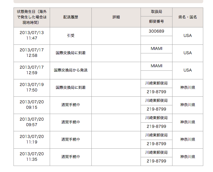 こういうバケツってさ、別に何に使うってなアテもないけど 欲しくなるけど、やっぱり、何も使わないってか(笑) で、ナタリーレテ繋がりで 作業机の上にナタリーレテのトレイ 飾ってみた。 でもって、土曜日のGianのオークションも無事終了。 昨日、旅立っていきました。 またまた良いご縁の所へお嫁(お婿?)に行けて 幸せ.:゚+(u_u*).:ポッ+ 入札、見守り隊! ありがとうございました<(_ _)> 昨日はうちのマンションの夏祭り ダンスサークルのダンスとかとか色々と盛り上がり 昼間っから、冷やし中華を食べながら ビールをいただきました♪ 画像、一番上は、「ヴィーガーデンのおやじダンサーズ」 真ん中は、クラブ全員のダンス 一番下のガゾは、スリラーを踊ってるママさんたち。 メイクとかもしてかわいかった♪ 他にも子供みこしとか色々とあったんだけど 途中日差しが暑くなってきて、これだけしか画像なし(笑) でもってでもって、アーメリカからの荷物! 今までは成田の税関での通関業務だったのが 国際郵便が川崎東郵便局に移った。らしい。 ほんでもって、なんかイヤな予感というのは当たるもんだ<(;~▽~) 当初はトラッキング番号を聞いてなかったんだけど 1週間近くなった時点で急に不安になって 教えてもらったんだけど……。 それで追跡してみたらミ(ノ;_ _)ノ=3 バタ... 「通関手続中」というのが 2度表示されていた。 だいたいの場合、「通関手続中」が2度表示されると 「引っかかった」というわけだ。 つまり、関税が取られる。。。。。 まあ、それはいいとしても、この手続きのせいで 手元に到着するのがすごく遅れるのが にくたらしいヽ(`ε´#)ノブーブーブー だって、お金取られて、早くなるってーのならわかるけど お金も取られて、遅くなるってーのが 許せん!! しかも、土日にかかると土曜日は午前中で業務終わるから これまた遅くなる要因が増える。 今回、まったくそのパターン。 しかも、しかもぉ~。 これを見てくだせぇ~~~~!! 「通関手続中」 4個も表示されてるぅ~~~~!!! (ノ゜0゜)ノ オオォォォォォォー 初めてのパターン。 一体、一体、どうしちゃたのぉ~~!! そ、そんなに妖しいパッケージに見えたのかしら? さて、いつ届くのだろう。 ちなみに、↑の状態は土曜日から変動なし。 ヌゥ~~~~( ̄‥ ̄)=3 フンガー *******拍手コメへのお返事******* f***様 (〃 ̄▽ ̄〃)エヘッ ほんとに、いつもありがとうございます(〃∇〃) てれっ☆ 「気遣い」が行き届かない時もありますが それでも、これからもよろしくお願いします♡ ほんでもって、ヤフの方もありがとうございました<(_ _)> 残念でしたが、またいつかのご縁を楽しみにしておりまする♪ で、仕事も、もう、あと101日! そしたら、一杯、お人形遊びするぉ〜〜と 今からワクワクしてます♪ ってか、今も充分にしてるけど(笑) お気遣い、いつもありがとうございます! .:゚+(* ̄◎ ̄*)ぶちゅ〜〜ん♪ m*****様 !!!!!! ありがとうございました!!!!! ♡♡♡(*´艸`*)♪