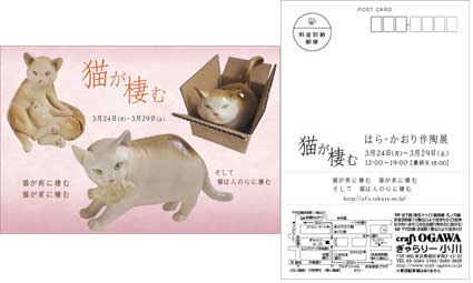 お友達のかおリンの個展 あいにくの雨だけど、いや、花粉を避けて 雨の方が良かったとも言える(笑) 陶製のかわいい、ほっこりとした猫たちが 一杯で…… (写真撮ってくるの忘れたミ(ノ;_ _)ノ=3 バタ... 後で、Sちゃんから画像、貰ってこよぉ〜(笑)) って、書いてたら、Sちゃんが画像、持ってていいよぉ〜って事で 以下、3枚は、Sちゃん撮影の画像。 ネッ(*´ 艸`)(´艸 `*)ネッ どの子も、ほっこりしてて、陶製だから、ほんとは固いのだけど 暖かみと優しさと柔らかさを感じる、かおリンの人柄が ボヨヨォ〜んっと出ている作品でほ?!(*´∀`*) かおリンに逢うのは、ほんとに ひっさしぶりで、いろんな話に花が咲きまくったぁ!! 楽しい時間をm(*>▽<*)m アリガトッ (そのうち、Sちゃんも誘って、一緒に、飲もうねぇ〜(*´艸`*)♪) で、晩酌の時に使う、取り皿、新しいラインナップが 欲しいなぁ〜って思ってたところで この2枚、いや、2匹を連れ帰ってきました。 さっそく、夕べは、これで晩酌♪ お酒の時間が一層、楽しくなったおぉ〜! で、話はちょいと変わって、旦那くんから 茨木のり子氏の「人名詩集」をススメられた。 (。・_・。)(。. . 。)ウン(。・_・。)(。. . 。)ウン これ、なかなかオススメ! 茨木さんの独特の、サバっとバスっと、熱い静かな言葉が グサっとズンズン、胸に染みまする。 最後の 桃下源の古譚を彼女流に読み替えた 「古譚」の最後は 圧巻だ! (前略) 「 妻子を守るというのなら 敵がほんとに この家に襲いかかってからにしてえな! 」 (後略) と、ここだけ抜粋すると、「これが? なんで? 圧巻?」と 疑問を抱かれるだろうけれども(;´▽`A`` でもね、いいんだよ! 文語体調の文章の中に突然、現れる 「じゃん!」(←これは↑の一つ前の文書に出てくる) と 「してえな!」 ヤレれるねぇ〜(≧∀≦) 我が国の「一番偉い」という方に聞かせたいわ!