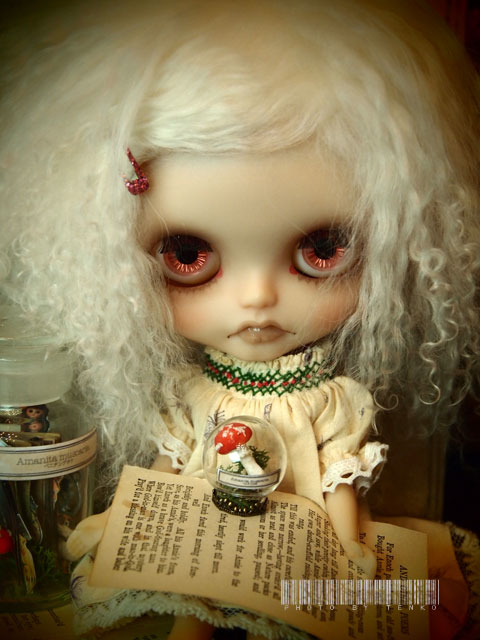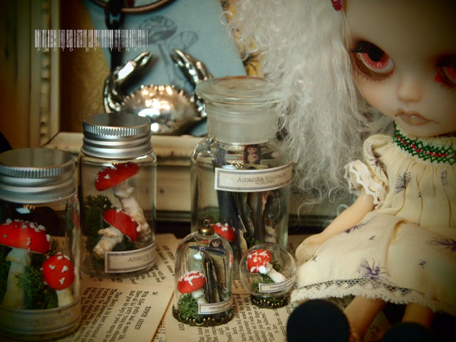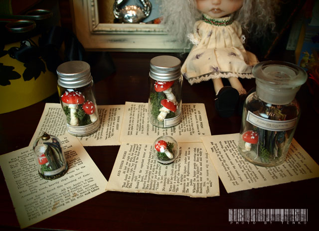 お寺さんが山を背にしてあるのだけど なかなか、風情がある。 けど、なかなか、その風情を画像に 切り取れない腕の哀しさ。。。 昨日はお猫様たちがお迎えしてくれた。 帰りは白っぽい子がお見送りをしてくれて すんごい幸せな法事だったわあ。 お堂にも♪ 山寺にお猫、よく合うねぇ~♡ でもって、12月のピザ屋さんのバザーに 出品する、ビン詰めキノコたちが ほぼ完了。 おコメちゃんの居る画像で 一つ一つ説明すると おコメちゃんに近い一番奥の 薬瓶に入ってるのは、本。と鍵とキノコなど。 本は、ページは読めないけど、いろんなモノが貼付けてあるので 瓶の蓋をとって、ピンセットでめくりながら 一人でムフフと楽しむための、セット(笑) そして、その手前球体。 奥の薬瓶の小さいバージョンのドーム型が手前真ん中。 2つ同じタイプで標本タイプ。 小さいのはブライスと比較するとこの大きさ というか、ちっこさ。 お値段決めなくちゃだわねぇ。 クリスマスのバザーなのに 何もクリスマスっぽくないなぁって思ったんだけど。 期せずして、赤と緑、 クリスマスカラーって事で .:゚+☆⌒(*^ー゚)b グッ!!(笑)