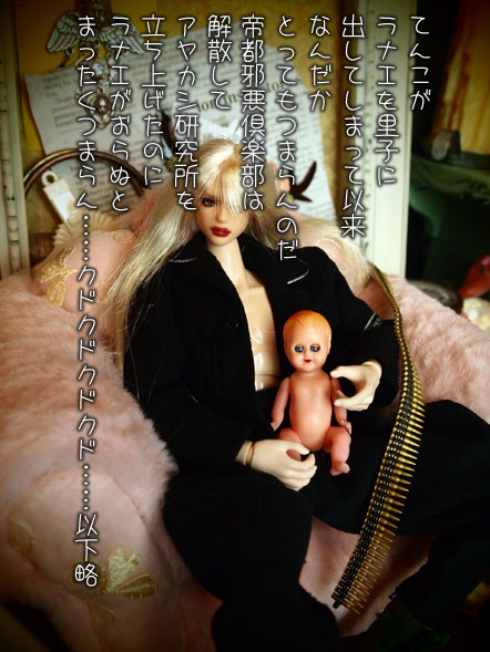 やってきました。 しかし!!! dollmoreの「12inches Basic Gem Doll - Graygem Dona (D.Skin + Black) 」 通常の納期は1ケ月〜2ケ月待ちなのに! 2日で発送された(;´▽`A`` な、何故???(・∀・)ナゼ? それは、きっと、きっと、 人気がなくて、在庫がワンサカと残ってるからよぉ〜 〜〜〜〜〜(/ ̄▽)/ 〜ф" なんかね、私こんな事多いの(笑) mydollさんのMj.Qooの時も、週末オーダーして 翌週末にはもうやってきたし<(;~▽~) 速いのは嬉しいんだけど、今回は 仕事してるじゃん? だから、そのお楽しみっつーかさ 「後1ケ月したら、あの子が来る! がんばろ!」 みたいな感じのスタンスでいたから ジェリベリ子と同じ日に着ちゃって 嬉しいやら、なんやらっちゅうか( ̄▽ ̄;) しかも、もう両極の二人でさぁ キャハハ!!(_≧∇≦)))ノ彡☆バンバンッ!! 名前は「羅奈江@ラナエ」 (//艸//) …ムフ♪ そう、あの、NANOはるかのラナエが 成長したという設定でお迎えしたのだ。 前置きが長くなるんだけど。。。。(〃∇〃) てれっ☆ NEO剛の兄さんたちよりは絶対に大きいとは思ってたんだ。 数センチだけど、でもヒール履くでしょ それに、目が替えられるタイプで お顔も絶対大きいと思ったんだ。。。 だから、釣り合うかなぁ。。。。(~_~; みたいに、悩んでて。。 でも、色々と物色するも「新生ラナエ」には 彼女がピッタリな気がしてさぁ。 お顔は東洋系でなくてはいけない。 あんまりマンガっぽくてもいけない。 美人さんだけど、陰があって しかも、完璧な美人さんではいけない。。。 みたく、色々とハードルがあってね。 で、お待たせしました。 成長したラナエさんです。 ほんでもって、さっそくデボラさんところに 情報が流れた模様!!! 喜んでる、喜んでるぅpupu (* ´>艸<)・:∴ PR