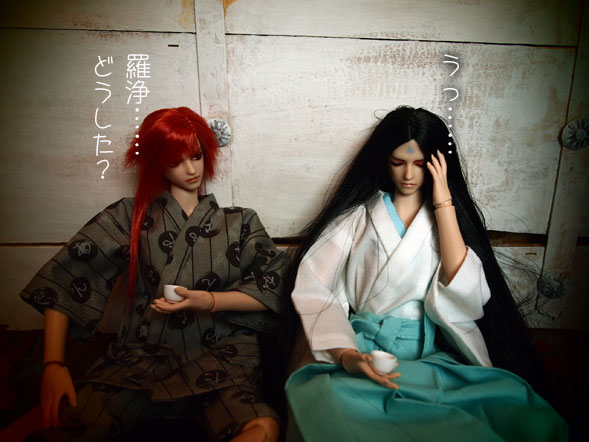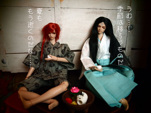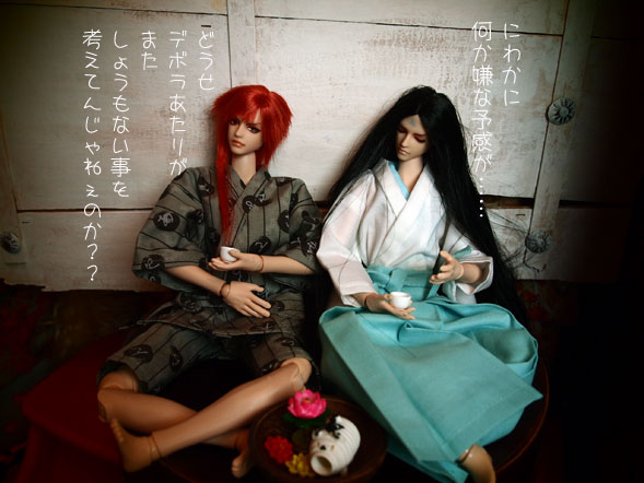 あ、ちにみにデボラさん 女性ではありません。(o*。_。)oペコッ デボラさんの言っている「帝都邪悪倶楽部」というのは チラっとだけ(つか1回だけ)紹介した事あったと思うのですが (それも遥か昔(笑)) NANO遥がまだうちに居た頃、デボラさんと彼女たちで 結成しておりました、なんか、こうよからぬ事を 考えたりする倶楽部であったりしたわけですが、 NANO遥が里子に行ってしまって、事実上解散に あったわけです。 で、そのNANO遥の名前が「ラナエ」だったのです。 ここへきて、デボラさん「邪悪倶楽部」 改め「あやかし研究所」 なるものを立ち上げて、 何かやらかしそうな雰囲気。 で、羅浄(@ラジョウ:右黒髪)と 羅閻(@ラエン:左赤髪)が 縁側まがいの所で酒を酌み交わしております。 こういうシーン。 私が愛してやまない夢枕獏の「陰陽師」の 冒頭シーンにはよく書かれている雰囲気。 『安倍晴明は、濡れ縁に腰を下ろし、 その背を柱の一本にあずけている。 折った左膝を横に倒し(中略) 細い指に玉の盃を餅、中に入った酒を、 時おり口に含む。 清明の横に座して、 同様に酒を飲んでいるのは源博雅である。 長い脚のある灯明皿に、 灯火がひとつともっている』 というような描写からだいたい始まる。 忠実な再現じゃないけど、さしずめ、 羅浄(右)が清明 羅閻(左)が博雅というところか…….: *:( *´艸`).:゚+ さてさて、デボラさん、 よからぬ事を考えてるわけなのか どうなのか? この続き、またかなり、間があくと思われますが…… (え? (*'д'*) 何故??? (?ω?)) この3人の事、ちょいと心に留め置きてくださいませな <(_ _)> 本日はここまで……。 |