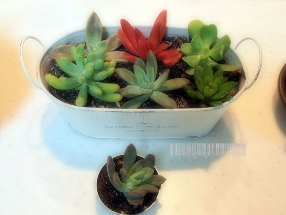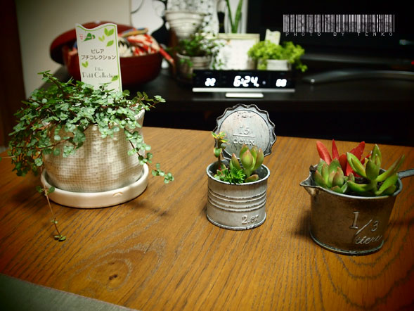 寒かったなぁ。 でもでも、今日は10月も終わりとは思えぬほどの ポカポカお天気♪ 昨日、ジョイフル本田で買った 多肉ちゃんたちも日向ぼっこ 一番左が「月兎耳」という名前。表面にフカフカと毛が生えてるのと やぱ、兎のお耳みたいでかわいかったのでお迎え でも、植え替えとかしてる間に、私の不注意で一番デッカイ お耳が折れたぁ〜〜(p_q、)シクシク なので、他にも取れたり、植え替えの時に不要な部分の子たちと 根っこが生えるのを横たわって待つ事に。 runちゃんに頂いた多肉ちゃんも、私にしてはどうにかこうにか だけど、がんばってくれてるぅ(≧∀≦) で、途中から折れちゃったんだけど、折れてまだ鉢植えの方に 残ってる部分ってそのままにしておいていいのかしらね??それとも、 これも取ってしまった方がいいのかしらん? どなたか、もしおわかりでしたら、教えてくだされぇ〜〜! (ネットで調べるも、折れた方の子は「土の上に寝かせておくと 根が出るので〜〜」ってな事は書いてあったけど、折れたモト側の子 はどうしたら良いのかは、見つけることができんかったのぉ<(;~▽~)) で、月兎耳の向かって右の子たち プラスチックの15×10ぐらいの器に 14個、ゴソと入って699円ちゅうお買い得な子たちで 連れてきちゃいました。 なので、どういう名前なのかさっぱりわかんないけど(;´▽`A`` この他に 右2つの子たちがそのパッケージに入ってた子。 こんな子や こんな子も一緒に。 左のは前行った時の子で夏場、もうダメかと思ってたんだけど ちぇぶちゃんの助言とかで、復活してきた子たち♪ もう、ダメかと思った子が復活するのって すごく嬉しいよねぇ。生命力みたいなの感じて こっちも元気になる♪ あとは、旦那くんがいつも生けてるリビングのコンテンツをちょいと 変えたり 葉っぱ1枚買って差してみたり♪ あれやこれやと緑を仕入れました。 これから冬に向かうからさ、やぱ、お部屋に 緑が欲しくなるんだよね。 それもなんか「草花」みたいな感覚の子たち。 で、多肉、一杯お迎えしちゃったけど ちゃんと根づくかなぁ。 パッケージに入った子たちは切りっぱで やっと、切り口が乾いたばかりの子。 多肉初心者(しかも腐らせ上手(;´▽`A``)な私としては ┣¨キ(*゚д゚*)┣¨キ。 でも、見るたびに(*´∀`*)ニヤニヤしてます。 やぱ、植物って癒されるねぇ〜。