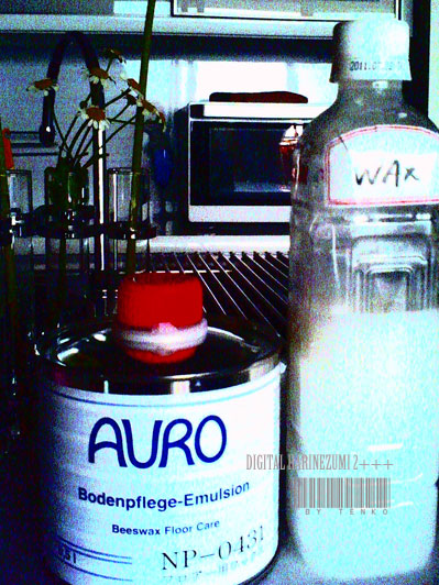 「床は消耗品だ」 という思いのもとに、コーティングとかそういうのは 一切しなかった。 ただ、サービスワックスを塗ってもらっただけだ。 さすがに、まだサービスワックスが効いてはいるけど 汚れは取りたいし、水拭きだけじゃ物足りないし、 かといって、普通のワックスって匂いがきついし……。 前のうちでは、フローリングつや出しマイペットが 手軽だから、床にスプレーしてクイックルワイパーで のばしていたんだけど、結構ムラになったりする……。 かえって、汚れを閉じ込めた感じなっちゃったり……。 ナチュラルで手軽にワックスがけ……ないものか……。 と探していたら、AUROフロアワックスなるものを 見つけた。 薄めて、ペットボトルに作っておいて、水拭き感覚で拭く。 ツヤが欲しい人にはイマイチだけど、香りもローズマリーと柑橘系で 爽やかだし、「ワックスかけましたぁ〜」感がないのがいい♪ やった後、ほのかに香るローズマリーと柑橘系 そして、さっぱり感があって大満足だった。 しかし、旦那くんには「ワックスかけた形跡」はわからなかったらしい(;´Д`) ちょっと悔しいけど、なかなか気に入った。