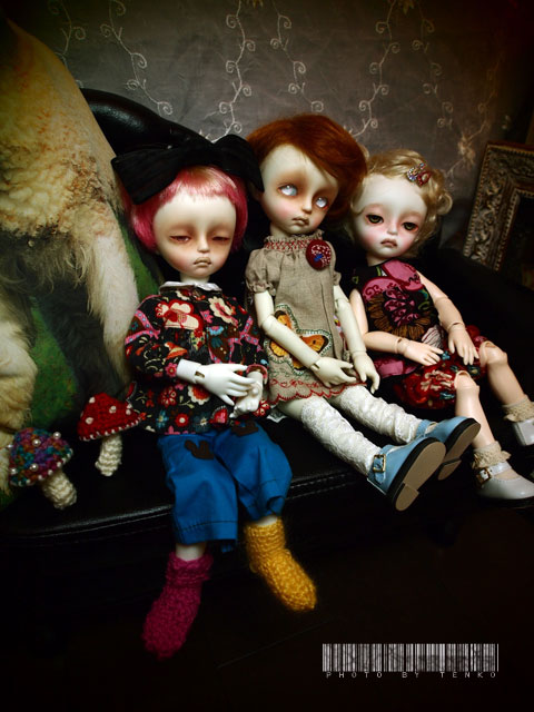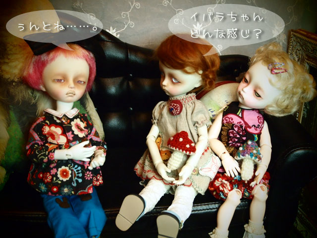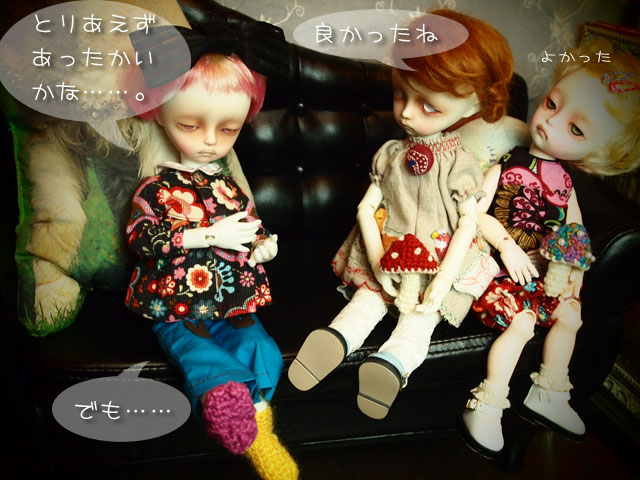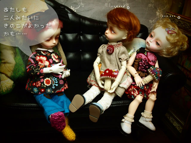 ブティック社の「かぎ針編みのミニチュア小物」 に、きのこの編み方も載ってたので またちょっと自己流に変えて(編み図の通りに編めないとも、言う(;´▽`A``) 編んでみた。 そして、iMdaっこ、純正ボディが1個しかなくて 3人姉妹がスリーショットになることは 今まで一度もなかったのだが、イバラにボディ調達! でもって、さっそく、新しいボディを装着したイバラにソックス編んでみた。 そ、そんなぁ<(;~▽~) やっぱり、きのこの方が、ソックスよりは 幾分、デキが良いかしらん(/_;) でもでも、まあ、寒いから、使ってよん。 手編みの靴下♪ でもって、3人姉妹 イバラ、ノバラ、バラミ で、こうやって名前を3つ並べてみると 「バラミ」もかわいいのだけど 「○バラ」とした方がゴロがいいやねぇ( ̄^ ̄;)ウーン イバラ、ノバラ、ミバラ ミバラ。。。。。(;´▽`A`` な、なんか、呼んでしまえば、それでいいような。 ユバラ。。。も、イケる。か。。。 でも、暫定的に イバラ、ノバラ、ミバラ に、しておこうか(*´艸`*)♪ あ、せっかくイバラに編んだソックスの全貌の 画像がなかったので、ペタリ
