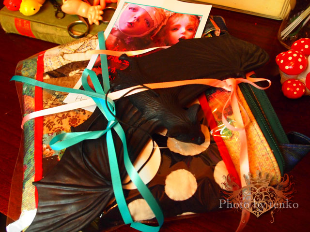 既に、ピナコとイエ郎をプレゼントに 頂いてるのだけど、 あの日の前から用意してた、モノがあるって事で 送っていただいちゃった!!! (*´艸`*)♪ 荷姿もかわいく、張り付いてるのは こうもりさんだぁ~~~!!! 今もこうやって、私の部屋を飛んでおりまする。 そして、ワイルドキルトちゅうかクレージーキルトっちゅうの? コラージュするみたいに、キルトしてく! jinちゃんは天才的にうまくてさぁ~! 文庫本カバーを頂き! すんごいセンスいいよねぇ~!!! さっそく、使わせていただいております。 そして、あちゃちゅむのムック本の第三弾だったか。 けっこう気に入ってたバッグだったのに あじゅこも気に入ってしまって 空気抜けるように改造して「あじゅこキャリーバッグ」に なってしまった、私のあちゃちゅむバッグ。 私が気に入ってた事を覚えてくれてて 2つになったぁ~! あじゅことオソロ(笑) ほんとに、これまたrunちゃん時もそうだけど jinちゃんもツボを心得てくれてて 感謝、感謝です♪ m(*>▽<*)m アリガトッ でもって、さきほど、Gian子のヤフオク出品完了しました。 オークションページは こちら お時間あったら覗いてねん。 土曜日、終了です♪