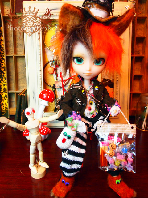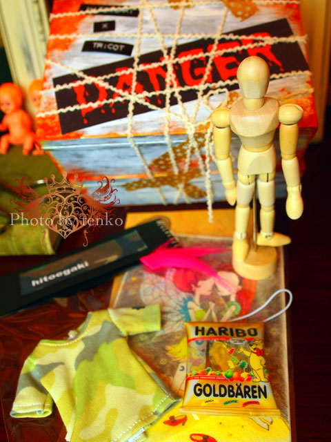 まったくの放置。 来たばかりの頃、ちょいとおコメちゃんの彼になりそうだったけど それもなんとなくポシャリ。 しばらくして、ラレ子とちょっと恋の話が持ち上がったけど それも、その後、何の進展もないまま、ずっと棚に。。。。 みなさんちのMAOが生き生きと活躍してるのを見ながら 我家にきたばかりに不憫なMAO。。。。ト、思っていたら。 マイミクさんのちぇぶちゃんと一絵ちゃんが コラボでイスル服を奥田氏。 それを一目見た時から! 「これだ! これなら、我家のMAOも、おはぎ谷で、『大』とは いわなくとも、活躍できるかも!!!」 と、天啓を受けて←大袈裟な(笑) がんばって、ゲットいたしましたぁ〜! それが昨日到着ぅ。 ヤフの出品ブツの他にも一絵ちゃんが オマケを入れてくださって、なんか ほんとにすんごいゴージャスなセット。 素敵なDANGER缶の中にOFセットは入っているのだ!! そして、一絵ちゃんのラブレターと一絵ちゃんのイラストの ポスカ。 おまけ、は、HITOEGAKIさんのTシャツとHARIBOのミニチュア、そして 美術用のヒトガタ さっそく、さっそく、MAO着てみました! で、美術用のヒトガタと、一緒に 居る彼を見て! 名前、ひらめいた!.+:。ヽ(*'0'*)ツ ワオォ!! ZIGZAG! ジグとザグだあぁ〜〜〜! 他にも芸の細かい、お菓子の数々! ちぇぶちゃん、一絵ちゃん ほんとに素敵なセットを m(*>▽<*)m アリガトッ 二人はMAOの恩人だす!! .:゚+(* ̄◎ ̄*)ぶちゅ〜〜ん♪ *******拍手コメのお返事******* f***様 今回のヤフオクはチマチマと少しずつ作っていたので 旅行から帰ってきてから、一気に! ってな感じで、週の始め、終わりが週末にという感じに こぎつけましたワ─+。:.゚ヽ(*´∀`)ノ゚.:。+゚─イ♪ Gian。ほんとにご縁があれば.:゚+(u_u*).:ポッ+ まだ、全然、初日から動きがないですがヘ(-′д`-)ゝ 最終日までよろしくお願いします<(_ _)> でもって、ほんとにツイッターの方 すみません! ほんとに、私、放置で! 今日から、ちゃんとチェックしますからねぇ〜!!!.:゚+<(*゚ー ゚*)>.: *:・ ツイッターのアイコン。 私カスタムモディ子にしていただいて 幸せです.:゚+(* ̄◎ ̄*)ぶちゅ〜〜ん♪ PR