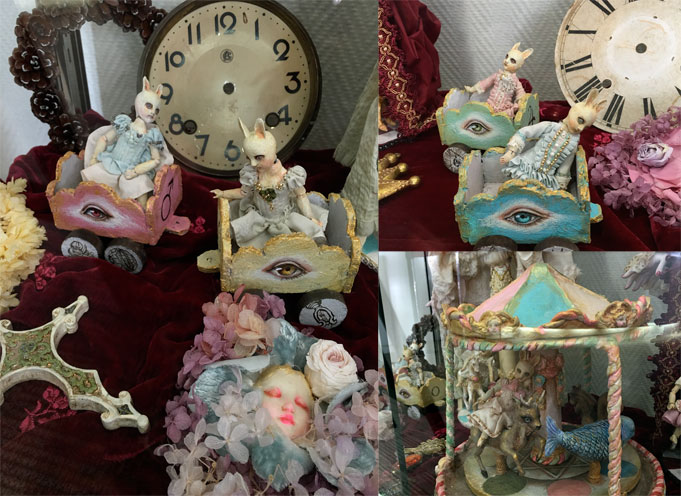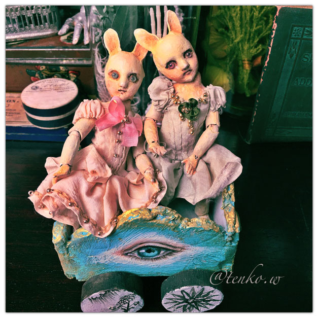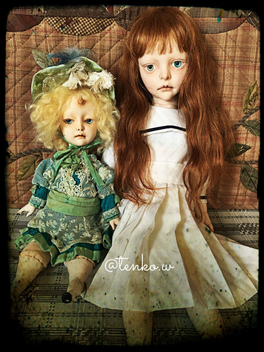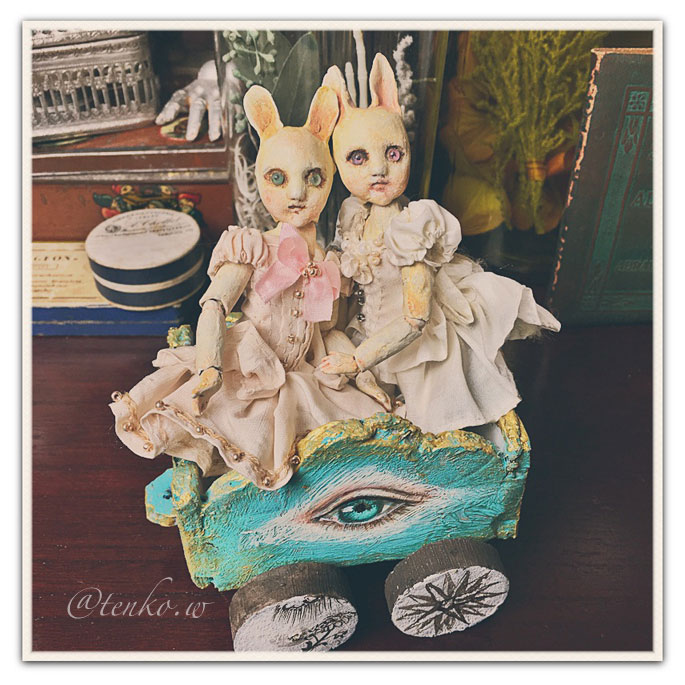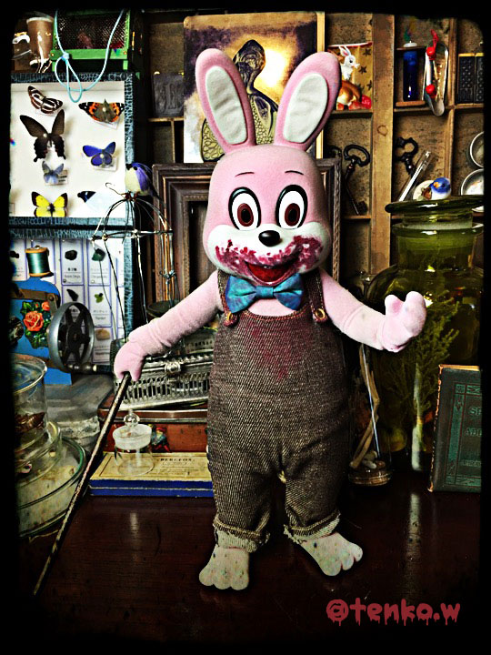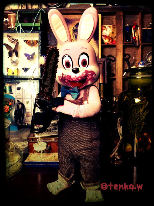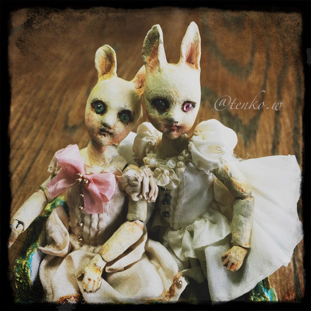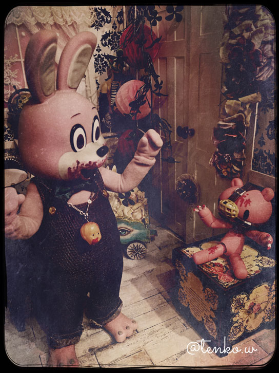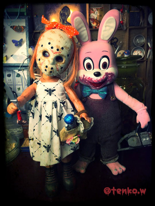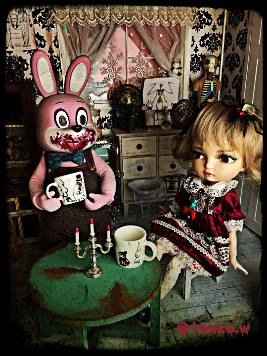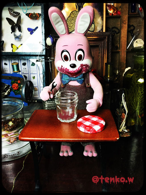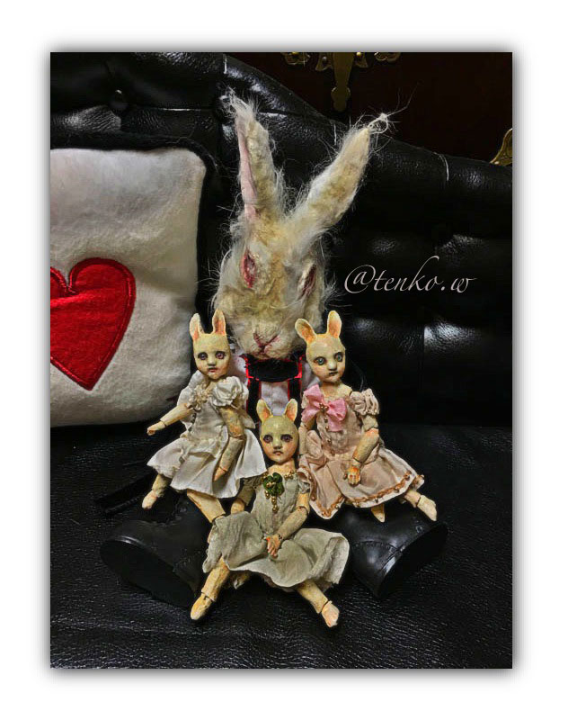 デジャヴ?! (?_?) いえ、今回は「あの」ウサギです。 ( ̄ー+ ̄) フフ…。 後ろ姿でわかった方は ホラー映画好きか またはゲーマーか.: *:( *´艸`).:゚+ イチゴジャムをお口に付けちゃってますが(笑) え? イチゴジャムじゃない? っと、ホラー映画ダメな方いらっしゃったら いけないので、改行入れます。 なんか「記事をたたむ」機能が 見当たらない(?''?;) 何故? ゲーム、映画の 「サイレントヒル」のあのロビー君です。 私ゲームはやらないのですが、映画はけっこう好き♪ ずっと悩んでたんですが、次のテンカスのコンセプトと 少しなんていうか、交錯しちゃって それで、なんかこれもご縁かなぁ。。。なぁんて お誕生日プレゼントとして(え? ( ゜д゜) 誕生日いつだよ?!) お迎えしちゃいましたとさ。 なので、もう今年のお誕生日プレはありませぬブツブツ…( ̄ε ̄;[壁] でもって、ジャム食べてる場合じゃなくて 鉄パイプとか チェンソーとか!!! このチェンソー、めちゃデキがいいわぁ!! ワクワクの小物たち。 でもRAHとしては、付属小物めちゃ少ないよね(;¬_¬) 鉄パイツとチェンソー、替え手が1パーツ。。そんだけだもん(~_~;) でもでも、総合的には大満足! ジェイソ子とツーショット。 ジェイソ子「私デフォの武器なくしちゃって 最近、ショッカーの戦闘員のナイフで 代用してるから、ロビー君! チェンソー貸してね!」 ロビー君「もちろんだよ!」 ってな感じでもう意気投合しちゃってて.: *:( *´艸`).:゚+ あ、ジェイソ子が着ているワンピは PTYのTちゃんがブラ子用に作ってくれたモノ。 でも、ジェイソ子、着られて、めちゃ似合ってるのぉ! m(*>▽<*)m アリガトッ と、ここでお披露目を! そんでもって、椅子に座らせようとしたら 股関節、曲げるのが怖いくらいに堅い。 でも、RAHだから、曲がるハズ。 でも、無理に曲げて壊れたら哀しいから。。。。 販売元に電話しましたわよ! そしたら 「あぐらとかはかけませんが、椅子に座るくらいなら 曲がります。着ぐるみの雰囲気を出すために 綿が詰まっていますが、勇気を持って、曲げてください」 との事。。。 しかし、勇気が、勇気が出ないぃ〜〜〜ヾ(>д< #))((# >д<)ノ゙! ので、ちょっとだけ曲げて。 でも、まあ座ってるみたいには見えるでしょかね(;´ー`)┌ ロビー君「ゴブちゃん、どうぞ、くつろいでいってね」 ゴブちゃん「てか、あんたの部屋じゃないでしょが」 と、またまた嬉しい、ウサギお迎えに ついつい、長々と綴ってしまいました。 おつきあいありがとうございます<(_ _)> この画像、憶えてらっしゃいますか? そうです。 清水真理さんの作品。 映画 『Alice in Dreamland アリス•イン•ドリームランド』 の会場のウィンドウの中にいた チビウサギさんたち(映画の中にも出てきてるよね?!)を激写した画像です。 それがね、それがね.: *:( *´艸`).:゚+ ご縁で、我家に3人(3羽?)もやってきました! キャ━━゚+.ヽ(≧▽≦)ノ.+゚━━ ッ ! ! ! どうよ、どうよ! どうなのよぉ〜! ほんでもって、清水さんの以前からいる 木馬ウサギに乗せてみる!! もう!! 高まるぅ〜〜〜〜〜!!! で、ございまして。 あ、3人やってきたけどね。 ベージュの子は、お友達の子です。 まとめて、我家へやってきて 後ほど、お友達の家へ行っちゃうのですけど こんな風にそうそう、3人で写真撮れないから 記念撮影! 我家に残るのは、ワンピが白とピンクの子。 この2人(二羽?)です。 名前ね。(ー'`ー ; ) 白い子が19日に、ピンクの子が20日に お迎えが決まったので 白い子が「十九夜うさぎ」 ピンクの子が「二十日うさぎ」 とか。。。 また、白が金曜日、ピンクが土曜日だったから 「金曜日ウサギ」と「土曜日ウサギ」 とかとか。 しかし、ピンクの子 「はつかウサギ」。。「はつかネズミ」だし 「どようびウサギ」。。「どようのウナギ」みたいだし。。 (;´▽`A`` 考えチウ。。。。 しかし、ハンパない妖しいかわいい子たち!! どうやら、おはぎ谷に「アリス」を探しに来たみたい.: *:( *´艸`).:゚+ 妄想がまたまた広がるお迎え。 ほんとに、つくづく、また「人形はご縁」という事を 痛感したのでした。 だって、あの日、ウィンドウを覗きながら お友達と2人 「このウサギさんたち、うちに来ないかねぇ(;´▽`A``」 「いやー、それはなかなかねぇ(;´ー`)┌」 「だよね。なかなかだよねぇ(;¬_¬)」 ってな、会話をしていたんだもん。 それが、「なかなか」を越えて、やってきてくれた! ほんとにほんとに、m(*>▽<*)m アリガトッ |