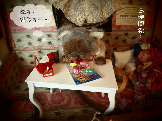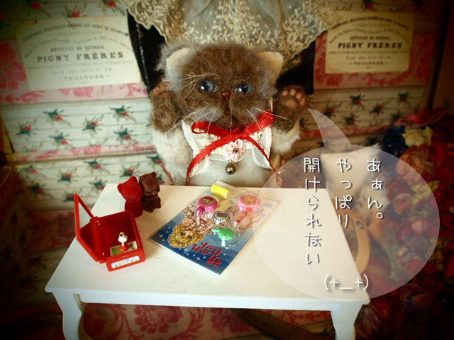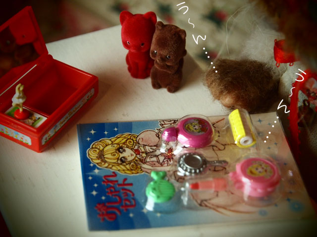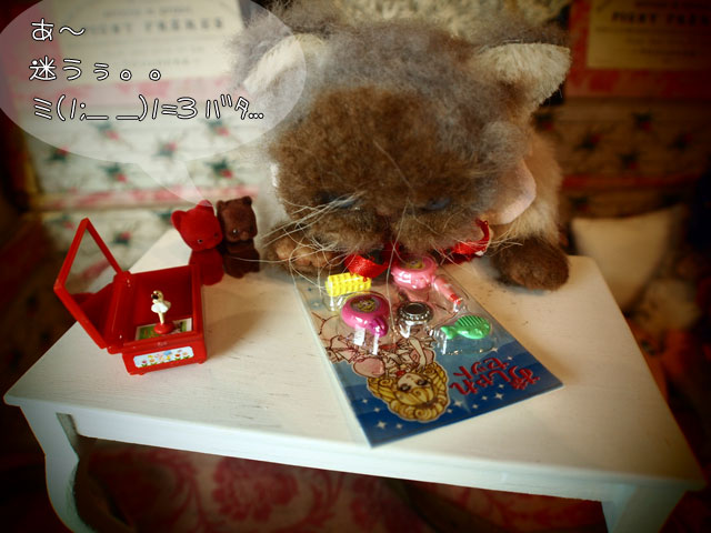 我家へやってきたブライス以外のドールたちの紹介、第一弾です。 Noeさんのめめちゃんたち。 気になりつつもご縁がなかった子なので とても嬉しいです。 青さんめめちゃんと、黄緑さんめめちゃん(アイの色のまんま)と 命名。 それから、ネジト博士の森の子さんたち 向かって左は森下猫さん、向かって右は(;´▽`A`` ちょっと事情があって(事情というのは、もとのヘッドが取れちゃってですね(爆)) ヘッドが違うんですが、スミスさんと命名。 4人とも、おはぎ谷で生息する事に決定しました。 新人4人さんに、おネギちゃん 色々とおはぎ谷の事を 紹介してるようであります。 意外に世話好きなおネギちゃん!? またまた、おはぎ谷が賑やかになりましたワーイ♪ゝ(▽`*ゝ)(ノ*´▽)ノ ワーイ♪ *******拍手コメへのお返事******* M****様 (*´艸`*)♪!! エンちゃんです。 (〃∇〃) てれっ☆ てんちゃんって呼んでいただくと かなり照れまする(笑) pupu (* ´>艸<)・:∴ で、エンちゃんの着てるワンピ。 これまた自分用の試作で、めちゃんこな作りなんですが まあ、うち子ならいいかと(笑) へっぽこお針子のOFを、そんな風に言っていただけて ほんとに、ほんとに、嬉しいです!! オッシ! お墓参りの旅が終ったら、ちょっとOF作りがんばろうかしらん♡ あてにしないで、待っていてくださいねん(〃 ̄▽ ̄〃)エヘッ ところで、台風8号は、今、どのあたりなんでしょうかね? M様の所にも大きな被害などありませんように!! うーん、うーんとなにやら うなり声(笑) 最近、ミハギさんとアケミさんが 乙女磨きのために カーラーで前髪(ないけど(笑))巻いたりしてるのを 見て、アジュリーナも 「あたしもやって……みたい……」 ってな具合で、おしゃれセットを前にして……。 ほんと、こういうセットって 開けられないよねぇ〜。 こうやって台紙に収まってるから かわいいっていうかさぁ(≧∀≦) 迷うのは、アジュリーナだけじゃない(。・_・。)(。. . 。)ウン 最近、「食玩欲しい病」が、ウズウズしてるんだけど 「これ!」っと絞れないで迷っていたりして それなら、昔ので遊ぼうと(引っ越しの時かなり処分はしたん だけど、残してあるのもちょっとだけある) ちょっと引っ張り出してきた。 またちょこちょこと遊びたいなん。 で、ずっと迷っていたベチュラのサンダル ポチりました。 ビリケン、じゃなくて(;´▽`A`` ビルケンシュトックの廉価版ブランドなんで 色々と悩んでたんだけど ビリケンじゃなくて、ビルケンシュトックは 次にとっておこう(笑) *******拍手コメへのお返事******* M様 いえいえ、ほんとに お心遣いいただいて とっても、嬉しかったです♪ 今回は、ほんと、色々と あれやこれや付属品が増えて 予定の水曜日には無理だったのです♪ なので、ちょうどよかったわけなのです。 ハーイ(〃^O^〃)ノ.: *:・ こちらこそ、 これからも、よろしくお願いします!! .:゚+(* ̄◎ ̄*)ぶちゅ〜〜ん♪ (〃 ̄▽ ̄〃)エヘッ 「チュゥ」はいらなかったですか?(笑) |