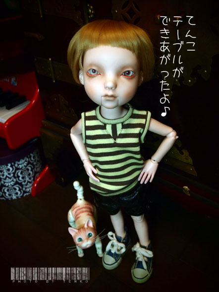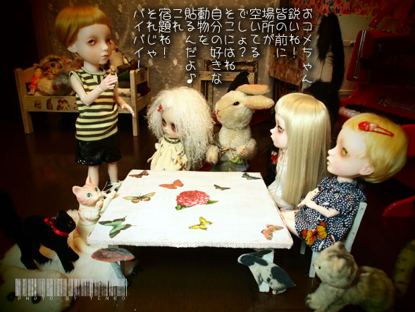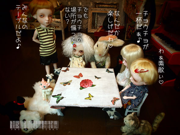 てんこ「やったぁ! もうできたのね。さすが仕事ハヤッ」 ラヒト「でさ、みんなを集めてよ」 てんこ「(。・_・。)(。. . 。)ウン わかった。」 。。。タタタッ。ヘ(;・・)ノ ラヒトの工作テーブルできあがりました。 全部うちにある物で作ってくれたから 製作費ゼロ円 *:・ヤッタァ♪'ヽ(゚▽^*)乂(*^▽゚)ノ バンザーイ♪*:・'゜ テーブルの一面には、この村(谷?)に生息する チョウチョたちを散りばめ、テーブルの足には 向かって左にきのこ、右にうさぎ(見え難いかな(;´▽`A``) でもって、みんなに宿題が出たわけです。 自分の前の空いているスペースに自分の好きな動物を貼る。 これで、みんなで完成させたってな感を ラヒトはやりたかったんでしょね。 ちなみに、テーブルの素材はAmazonのダンボールpupu (* ´>艸<)・:∴ でね、この村(あるいは谷)の名前。 りおんちゃんが 「おコメちゃんの『お』とミハギさんの『ハギ』で 『オハギ村』っちゅうのはどう??」 って提案してくださって (ノ゜0゜)ノ オオォォォォォォー それは、なんと素敵なぁ〜!! と、もうそれに決めようかと思ってたら。。。 いた。。。。ミ(ノ;_ _)ノ=3 バタ... 転んで痛いんじゃなくて、Ginnyに「おはぎちゃん」って 居たんだよぉねぇ〜<(;~▽~) なので、やぱ、「おはぎ」は「おはぎちゃんの」 「おはぎ」だから。。。 ちゅうことでちょいと考えちゃって。。。 ほんと、素敵なイイ名前だと思ったんだけどねぇ〜。 りおんちゃぁ〜ん!! ごめんねぇ〜(/_;) さて、そこでまた困ったぞ。 村(あるいは谷)の名前。。。。 安直に自分の好きなモノで 「金魚谷」とか???? いっそのこと、プレ付きで公募する??(;´▽`A`` PR てんこ「ラヒト、何やってんの?」 ラヒト「あのね。おコメちゃんやミハギさんたちが お茶会に僕のピアノを 使っちゃうんだよ」 てんこ「あ、そういえばそうだよね」 ラヒト「てんこがテーブルを買ってあげないからだよq(〃・`з・´〃)p モ─ッ!!」 てんこ「(^_^;A だって、デカイ顔のあの子たちが 4人並ぶテーブルって なかなかないのよん(;´▽`A``」 ラヒト「だと、思って!! 僕が作ってあげる!!」 てんこ「.+:。ヽ(*'0'*)ツ ワオォ!! ほんとにぃ??」 ラヒト「それに今度お茶会の時、ピアノを聞かせてあげたいしね♪」 てんこ「悪いねぇ〜(〃・ω・)ゞえへへ。あれ? その猫は? ラヒト「リュドミラだよ」 てんこ「リュ、リュド……」 ラヒト「リュドミラ。グリンカの歌劇 「ルスランとリュドミラ」の リュドミラ姫から名前をもらったのさ♡」 てんこ「あ、そ、そうなの(;^ω^) へえ〜(^_^;A。ま、とにかく よろしくねん♪」 ラヒト「うん、まかせて!」 ラヒト「あ、ちょっと、リュド、邪魔しちゃだめぇ〜!!」 リュド「ニャァ〜ン♡」 てなことで、ラヒトがおコメちゃんたちの テーブルを手作りしてくれることになりました。 孝行息子じゃ(笑) で、おコメちゃんミハギさんリュララレ子たちの暮らし。 なんか、こう、名前つけないと ブログのカテゴ選びの時、とりあえず、今は 主な子のカテゴに入れてるんだけど どんどん、増えてきちゃう。 なんか、「ムーミン谷」とかさ そんな名前付けたいんだけど だったら「おコメ村」???? 農家かpupu (* ´>艸<)・:∴.: とにかく、なんか考えよぉ〜っと♪