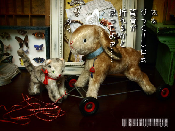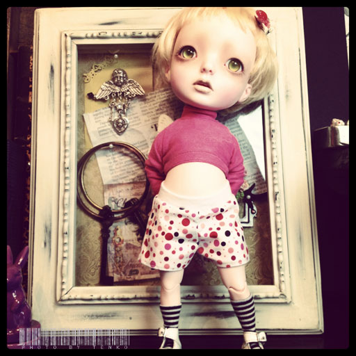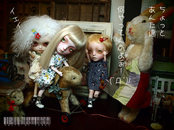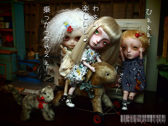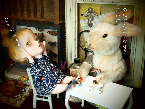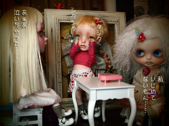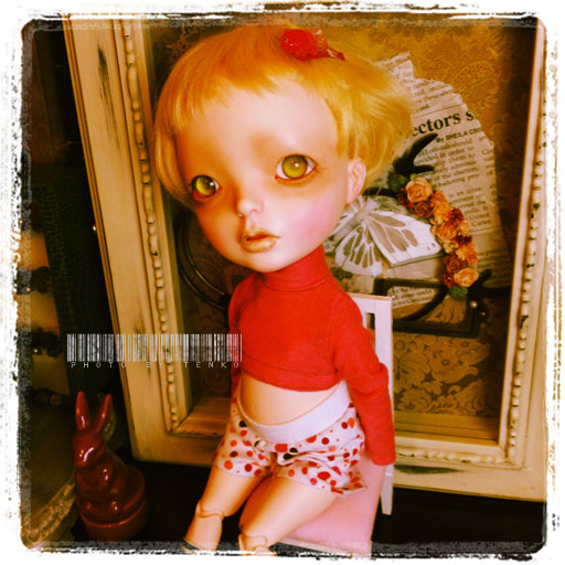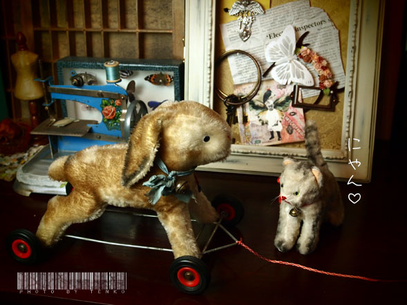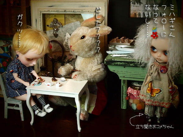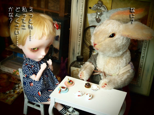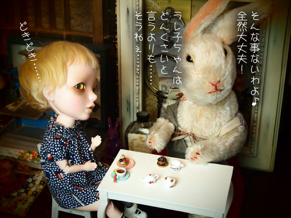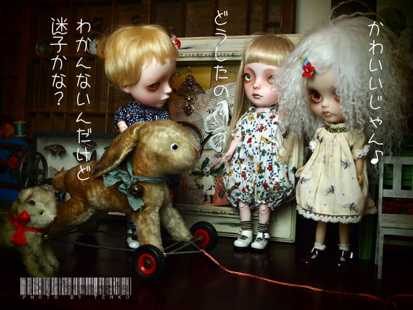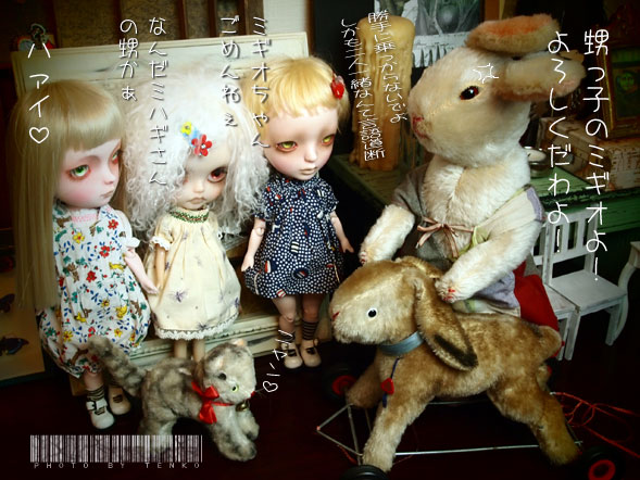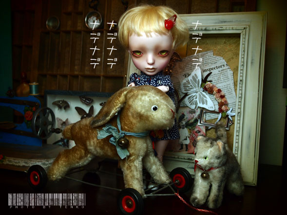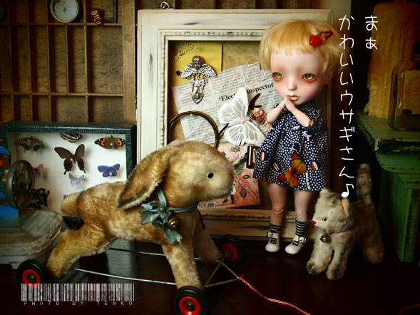 そう決意してから、なかなかどの子をお迎えするのか 決まらなかったんだけどね。 (そうこうしてるうちに昨日は二度目の給料日(^o^)v) 「これ!」っていう子が なかなか決まらなくて(;´▽`A`` しかし、考えてみた。 「これ!」と思う子は、別にほんとうに お迎えしたくなったら、初任給じゃなくても きっと、お迎えしちゃうよね? 自分??? そうか、そうだよ。 そういうお金じゃなくちゃ、そういう機会でも なくちゃ買わないような子!! そういう子にすればいいんじゃね??? と、思い始めていた。 で、木曜日、友達の個展に根津に行ったんだけど そういえば、乱歩の隣に「Biscuit」(ヨーロッパの雑貨とか お人形のお店)がある事を帰りにふと思い出して 寄ったのだった。 そしたら、うさぎに出会ってしまった。 んだけど、その子のお披露目はまた明日にでもするとして 今日は、その時に一緒にゲットしたモノたちの方をちょいと お披露目。 ヾ(^o^) オイオイ じらすのかよぉ〜!!ヾ(-_-*) オイオイ (〃・ω・)ゞえへへ ごめんね。 まずは、昨日ノバラも着てたけどヴィンテージの子が 着てたOFセット。 きっと誰かが着られると思ったんだよね。そしたら けっこう、いろんな子が着られそうで リュラ子、着てみました。お帽子もセット。 と、そこへラレ子 と、そこへ謎の少年が すごく喜んでるらしいが、フィリッポ・インザーギ少年 固まっている模様.: *:( *´艸`).:゚+ そこへ、おコメちゃんと飼い猫の稗(ヒエ)がやってきて……。 謎の少年はどこの子かわかんないんだけど、 このパァと開いたオテテとスリープするアイ♪ そしてこの表情に惹かれて連れ帰り、 名前は私の大好きなサッカー選手からいただき 「フィリッポ・インザーギ」となりましたpupu (* ´>艸<)・:∴ で、猫ちゃんのぬいぐるみは、前からシュタイフの子は欲しかったんだけど なかなかご縁がなくて、この子もシュタイフじゃなくて Herman社の子なんだけど(だからかめちゃんこお値打ち価格) 綺麗な瞳に惚れてこれまた連れ帰り♪ あとは、細々と こんなの買ったりして、初任給のお祝いとしました♪ あ、で、うさぎは明日ねん。。。  ̄∀ ̄* ニヤッ
