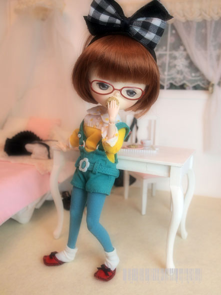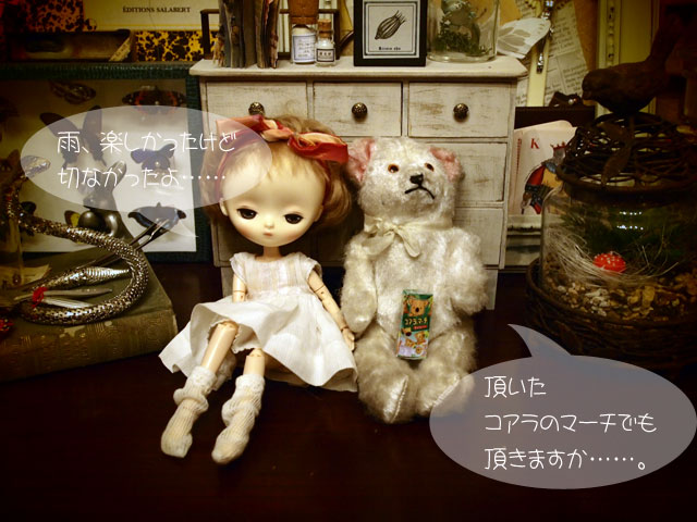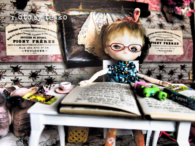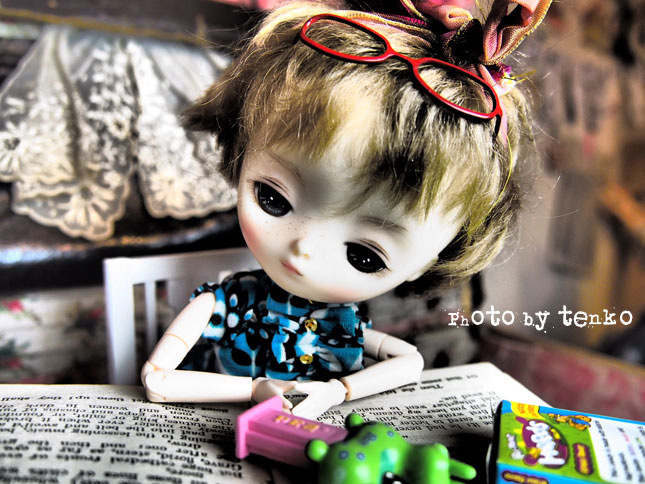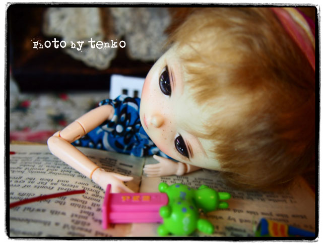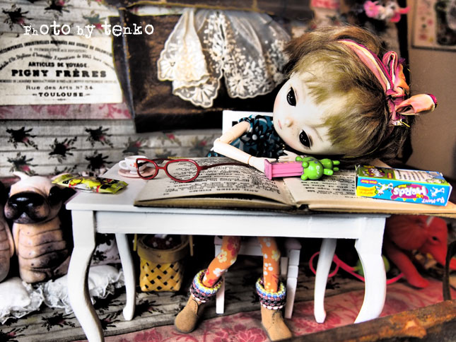 それに刺激されて、うちもジェリベリさんの ぬりえ*pennyと遊ぶ。 この前はエンちゃんがこのトランクルームで 本を読んでたけど、今日は、ぬりえ。 ぬりえは、スリープタイプなので、どうしても 淋しい感じになりがち。 それもあんまり遊ばない理由だったかもなので 先日、眉を落としてみた。 それでも、まだ、淋しい感じだったので 眉を太めに描いて、ソバカスを入れて、目元も二重の描写を太くしてみたら 「淋しい子」から「不機嫌な子」になった感じがして ちょっと満足(゚∇^d) グッ!! さっそく、クッキーなど片手に読書。 不機嫌&アンニュイ子だからすぐに疲れるのね。 疲れた。。。。。 (*´Д`*) 〜з やっぱり、疲れた。 絶対に、疲れた。 かなり そして、 ついに。。。。疲れた。。。。的なpupu (* ´>艸<)・:∴ ほんでもって、意を決して ストレッチなどしてみる。 リフレッシュして、 さて、また読むぞ。。。みたいな感じで、 フムフム。 ちょっとは色々な表情ができる子になったじゃぁん。 余談ですが、夕べは、蚊が1匹、寝室に入り込んでて その、1匹のために、全然、ぐっすり眠れずバタリ ....(o_ _)o...〜〜〜† 眠りに深く入ろうとすると、耳元で 「フゥ〜〜〜〜〜〜ん」って。 なんか、旦那くんの方には行かず、私の方ばっかり。 幻聴か? と、色々、試しても、やっぱり 「フゥ〜〜〜〜〜〜ん」って。。。 くっそぉ〜。17階にも、エレベーターに乗って、蚊がやってくるのだ!!!! で、ほんと、旦那くんは、迷惑そうな様子で ムニャムニャ。 幻聴じゃないんだからぁ〜〜〜!!!<(`^´)> で、昼間掃除機かけてたら、居た! 居た! いたぁ〜〜〜〜!!!(ノ゜0゜)ノ オオォォォォォォー でも、しとめ損なったよぉ。。。(;´д`)トホホ… パチってやろうと、したら、掃除機につまづいて、転びそうになった。。(;つД`) まだ、どこかに居るに違いないq(〃・`з・´〃)p モ─ッ!! 今夜は睡眠を邪魔されませんように!!!! PR
