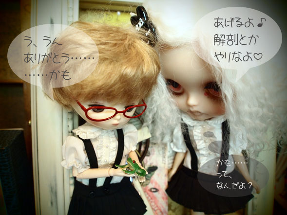 「ぬりえ」っちゅう名前になりましたわ。 もう一人お迎えしたら 「きりえ」ね。。。 などと、考えて.: *:( *´艸`).:゚+ ほんでもって、エロイーズちゃんのあの 制服(じゃないんだけど)セットを もう1着、ちょっと前にゲットしてて これで4着!! ぬりえ、クラスメイトに加わりました。 さっそく、おコメちゃん、ご挨拶がわりに♪ RJちゃんもそのブログで書いてたけど ブライスとは 多少頭の大きさ違うけど そんなに違和感はない(^o^)v こうジェリベリ子はそのハンドパーツの 繊細さと可動する事から チマチマしたモノを持たせたくなる 衝動にかられるのであった。 でもって、調子悪かったのは、膀胱炎。。。のせいミ(ノ;_ _)ノ=3 バタ... 病院へ行ってきました。 菌は検出されなかったけど、赤血球、白血球ともに 検出されたので、抗生剤と漢方薬を処方してもらいましたぜ。 これで、マルっと治るかなぁ。 で、病院でカルテを盗み見したら(笑) ちょうど、去年の10月にも(27日だけど) リンパが腫れて病院にかかってました。 この時期、やぱ、なんとなく 調子悪いんじゃね??? ってな感じです。 ふむ。でも、まあ、病名もちゃんとしたし お薬も貰ったし、イイ子にしてお薬飲めば 復活するだろね♪