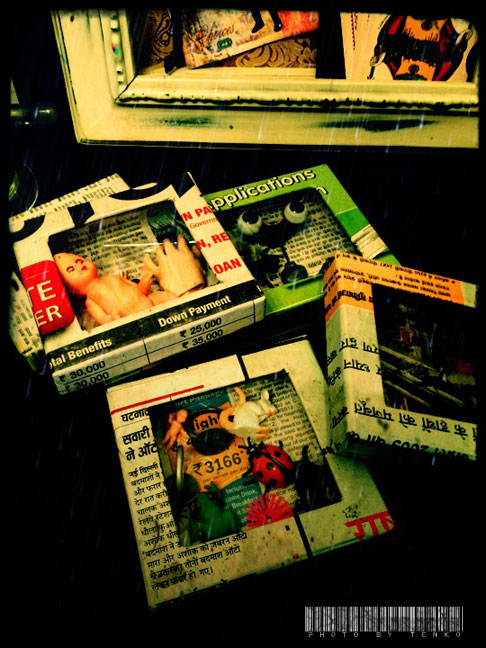 なかなかそれが抜けないので 31日からずっとおうちなの( ̄▽ ̄;) 買ったペンタブでお絵描きなどしてみたりしてる。 が、しかし、やぱ、私ってばお絵描きよりも コラージュの方がむいてるかも。。<(;~▽~) と、いいつつ、 ヒイラを水彩画風で描いてみて、がっかりして コラージュして誤摩化したり ウサギさんとクマさんのおもちゃを描いてみて、がっかりして コラージュして誤摩化したり とかして、遊んでたりする、それはそれで楽しいけどねぇ。。。 それから、一昨年買った、ウォールステッカー。 何度もはがせて使える。。。ってーのを買ったんだけど ヘタれなんもんだからさ、なっかなか、 どこに、どういう風に貼るかが 決断できなくて、ずっとそのままになってるヤツ。 今年こそは、貼ってみようと画策中。 が、しかし、やっぱりヘタれで、ドバっといけないよぉ。 なので、ちょいと隅っこに、小さい部分を貼ってみて はがしてみた。 チョウチョの部分。 お、簡単にハガせる。ハガしても壁紙も大丈夫だし。 と、試してみて、近々、行動を起こしてみようと 決心した。 ほんでもって、チマチマした物を 箱に閉じ込めるのが好きで こんな紙の箱を5個も買ってもうた(~_~; なんか、なんでもないモノを ポイっと入れた時に、それがなんだか コラボしあって、小さい空間が すんごい饒舌に語りだすことがあったりするから 好きなのだ。 さてと、今から、夕飯と明日のお昼の お買い物、行ってこよぉ。