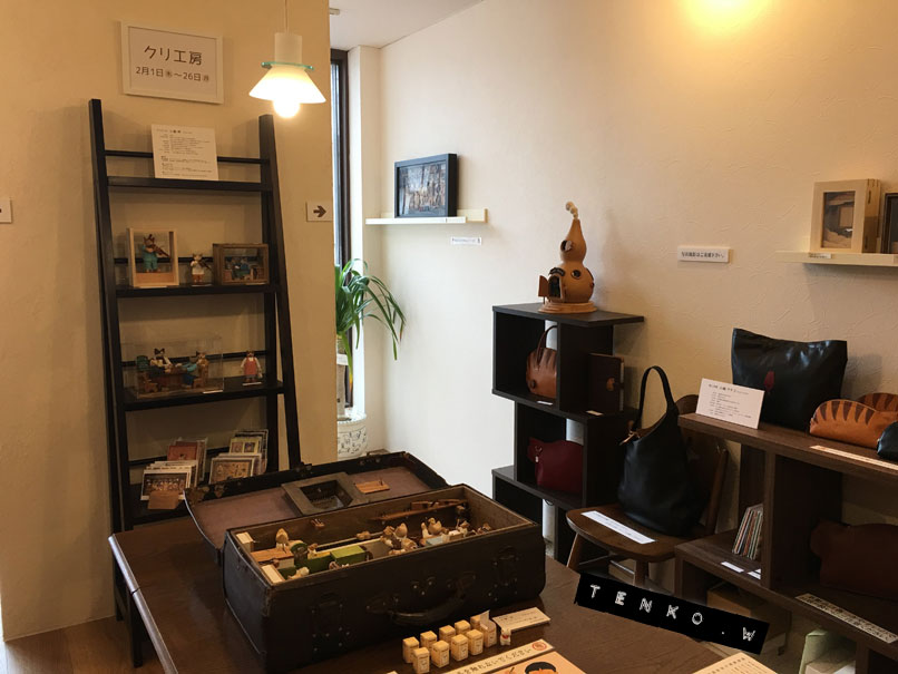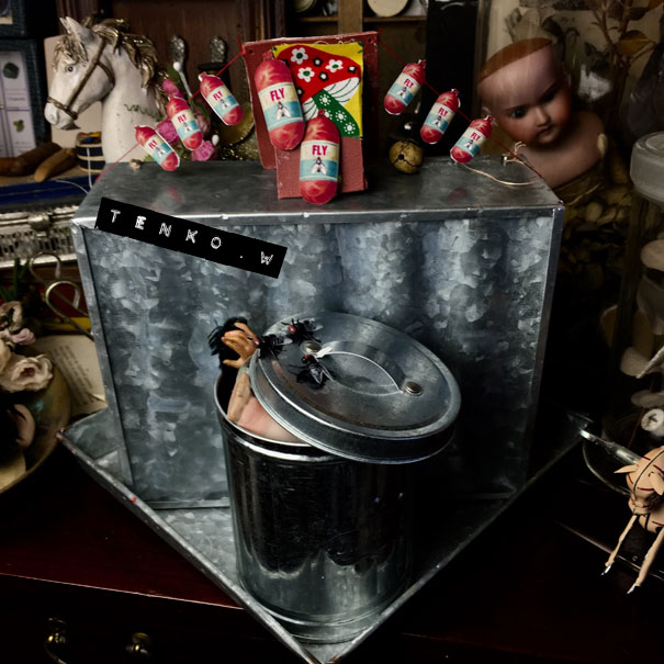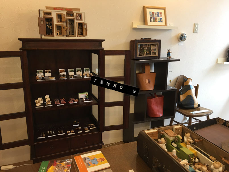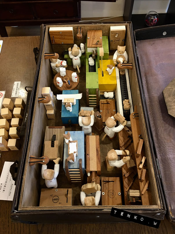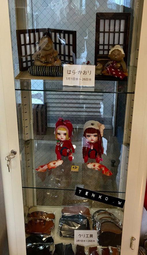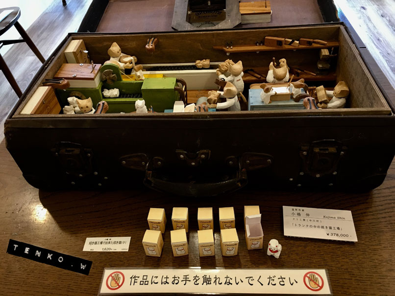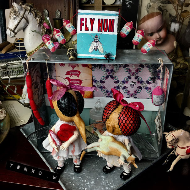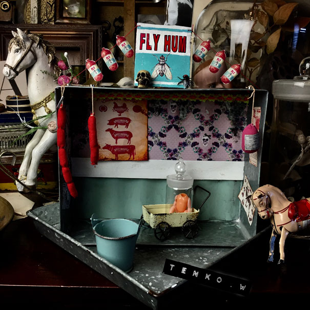 川越のギャラリーRooMさんへ DMと告知展示のための 作品を納品に行ってきました。 来月は、かおりんの展示でその後なので 2段目に♪ そして今月はクリ工房(ウッドール小嶋伸さんと革工芸サチコさんご夫婦)の 展示で 猫をモチーフにしたウッドのドールの伸さんと これまた猫をモチーフにした革の作品のサチコさん ご夫婦。 伸さんの「招き猫工場」 これ、スイッチを入れるとベルトコンベアーが 動いたり、電動ソウが動いたりするんですよぉ♪ で、そこで作っている「招き猫」も売られているという 芸の細かさ.: *:( *´艸`).:゚+ お隣のArc jewelry studioのご主人がアンティークの コーヒーメーカーでコーヒーを入れてくださった 手間はかかるんだけど、アンティークって なんでこんなかわいいんだ!! DMと搬入の打ち合わせをしたり あれこれとかおりんと(ちょうどこの日はかおりんが お店番)そして、他のお店や オーナーさんとお話して 楽しい時間を過ごしました。 あともうちょっと時間があるから まだまとめに入らず 頑張って、作品作ろぉ〜! って事で、「FLY HUM」の店舗を 製作。 裏に回ると、手や足が入ってる 大きなゴミ箱があったりする( ̄ー+ ̄)ニヤリ…。 そして、ハエミが ハエミ「カンガルー、拾ったんだけど、カコちゃん カンガルー、さばいたことある?」 カコ「ないけど……。てかさ、それさばいちゃって いいの?(^_^;A」 ハエミ「さぁ(?ω?)」 ってな、ダークな会話をしてたり.: *:( *´艸`).:゚+ 全体的にエイジング処理をして 完成です。