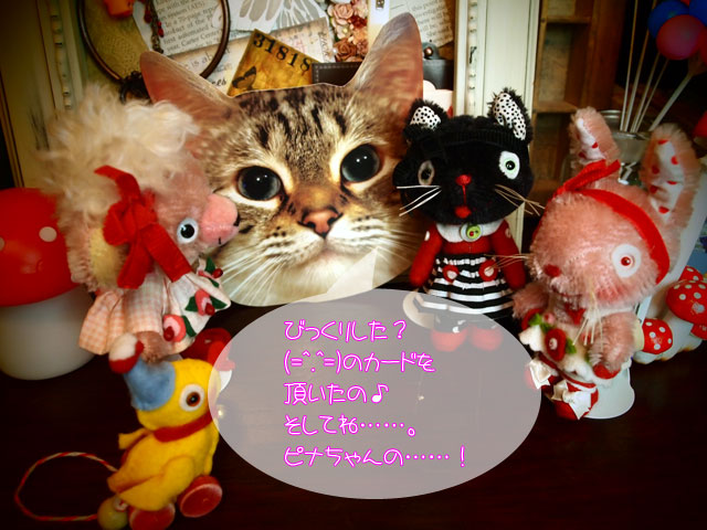 「おまけ」のお礼だという事で サプライズプレがありましたんワーイ♪ゝ(▽`*ゝ)(ノ*´▽)ノ ワーイ♪ (/▽\) イヤン (=^.^=)のお顔のカード!! これで茶トラだったら みゆ坊にそっくりぃ〜〜〜〜!!!! そして、カボショとかビーズとかのパーツを 一杯! それにそれに、ピナコをモチーフにペンダントヘッドを 作ってくださったのです。 (ノω≦。)…ジーン…感激ぃ!! もう、たいした、オマケじゃないのに 申し訳ないです! こういう「ご縁」みたいなモノで繋がれる ヤフオクは、ただの、オークションツールでは ないと、最近、すごく思うのであります。 まあ、事務的なお取り引きってーのもあるけれどさ(;´▽`A`` でもでも、ヤフオクは、 それまでまったく接点のなかった方々と 繋がる事ができて、そして、また そのご縁が、色々と嬉しい事を生んでいってくれる♪ ネットっつーのは色々と問題もあるけれど 私には、とっても、素敵な場所であります! M様、m(*>▽<*)m アリガトッ .:゚+(* ̄◎ ̄*)ぶちゅ〜〜ん♪ *******拍手コメへのお返事******* R*ちゃん (。・_・。)(。. . 。)ウン(。・_・。)(。. . 。)ウン そうそう、ほんとに、不具合とかはまあ、おいといて ほんとに「カワイイ!」子は、 めちゃんこ、カワイイよね!!! (〃 ̄▽ ̄〃)エヘッ ラブミーさん、生き生きしてるって言ってもらって 嬉しい! ほんとに、かわいいのよぉ〜。 アレクシスとアニバ。。。。。 だよねぇ〜(;´▽`A``(笑) ペニさん、彼女はほんとにかわいいよぉ〜! 個体差もきっとあるんだろうけど Rちゃんちのペニさんだったら。。。欲しいもぉ〜ん。 ヘアマキマキだし.:゚+(u_u*).:ポッ+ で、ラブミーさん、後ろ髪はかなりひかれたけど そっと、箱に戻した。。。 カスタムする時に、もう一度、絶対に 葛藤があるだろなぁ〜。。。。 と、思いつつ。。。。。 PR