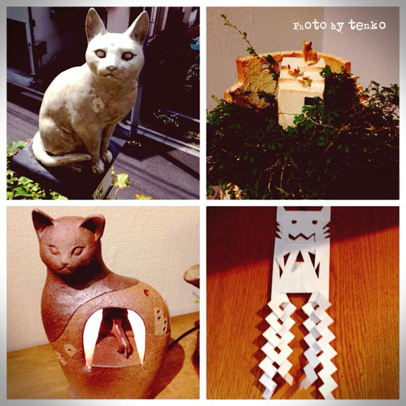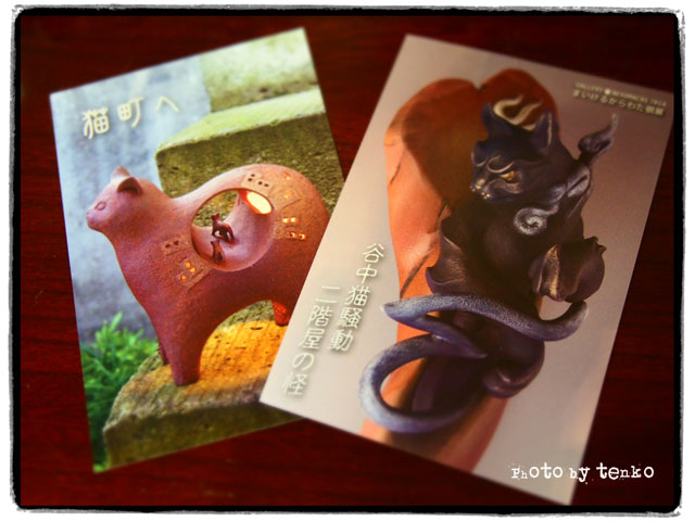 お友達のかおりんの個展。 かおりんは1階。 左上は、いつもの猫町、お迎え猫。 右上は、陶器のプランター。とても味があって、 猫も居て、グリーンが生えるわぁ。 そして、左下は、ライト。 右下は、2階で、「谷中猫騒動 二階屋の怪」という題目で まいけるからわたさんという方が個展をやってらしたので そちらも、覗かせていただいた。 まいけるさんの猫たちは、妖怪系なので、御幣、しかも猫型御幣が そここに貼ってある。 それ、頂いちゃった。まいけるさんの判子押してあるの♪ ↑を上手に切ると、右下の御幣になる。 ちゃんと切れるかしら(笑) かおりんとまいけるさんと3人で、 モノ創りの事とか色々と話せて 楽しい時間だった。 で、かおりんのほっこり猫と、まいけるさんの妖怪猫 対比が面白くて、それぞれが際立ってていい組み合わせの個展だったなぁと♪ もう明日しかないけど、お近くにお寄りの際にはぜひ。 ほんでもって、カオリンに指人形貰っちゃった(〃 ̄▽ ̄〃)エヘッ NHKでやってたハッチポッチ劇場みたいな、ご婦人と探偵さん♪ m(*>▽<*)m アリガトッ でもって、一昨日あたりから、ちょっとヤバイなぁ。。。とは感じてたんだけど きました!!! 秋の鼻炎!!! (*´Д`*) 〜з ハァ〜。。。。 すっかり秋になったって事だよねぇ。 ズビズビ (〃>д<)、;'.・ ィクシッ 薬は飲んだけど、ボーっとしちゃって 何もやる気がおきませぬバタリ ....(o_ _)o...〜〜〜† サマ〜〜〜〜!!! カムバァ〜ック!!! (」°ロ°)」 オーイ!! PR