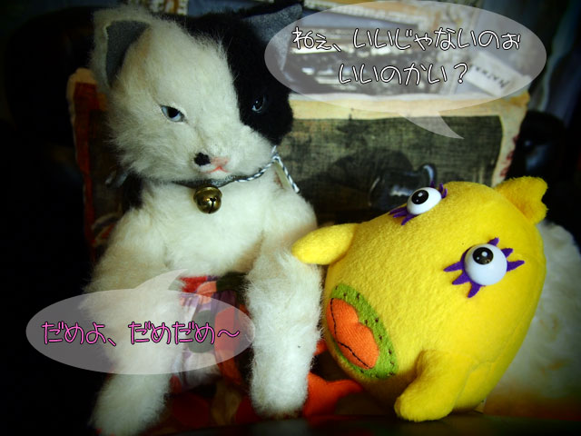 あけみさんじゃなくて、あけみちゃん。 うちの、あけみさんも、やってみたくなったそうで(;´▽`A`` 相手は、ヒヨコのコマネチ。 なんか、コマネチの方があけみちゃんぽい メイクですが(笑) 我家、ただいま、「エレキテル連合」にハマってます。 最初に旦那がハマって、youtubeを見て、 私にオススメしてくれたのだ。 以前、バミリオンプレジャーナイトというテレビ東京の 深夜番組があって、それも大好きだったんだけど 同じニオイがする♪ お笑いというよりも、演劇に近いニオイがするし 彼女たちの出身地がご近所だという事もあって なんか、親近感(*´艸`*)♪ きゃりーぱみゅぱみゅちゃんのご実家も近くだし この辺の女性陣、がんばってるなぁ〜!+.Σd(>∀<*)♪゚+.゚ で、今、iMda3.0のOFセット、製作チウです。 来週あたり、ヤウオク出品予定しておりまする(^_^) 今日は寒いなぁ。。。 今年は、夏が終って1ケ月、季節がドドっと前倒しに 来ちゃってってな感じだぁ。。。ブルブル…{{{{(;>_<)}}}}…サムイ… PR