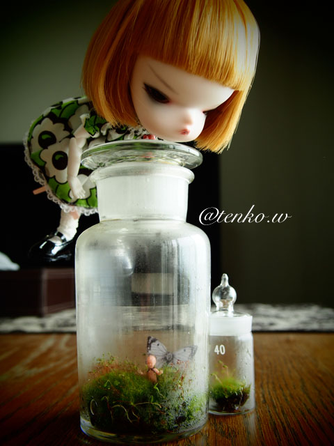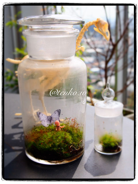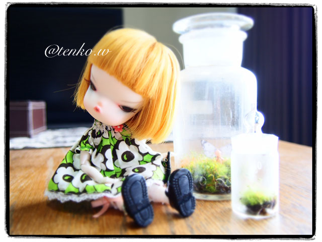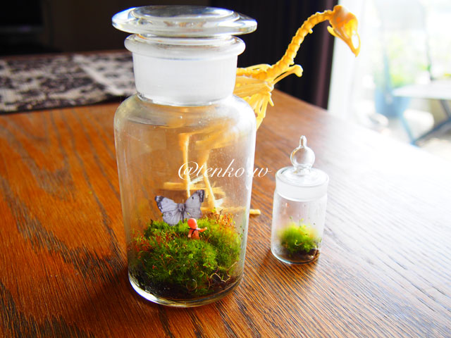 以前、私も挑戦した事あったけど 結局、室内では枯らしてしまって ベランダの植木鉢に自然に生えてるコケを 楽しんでいたんだけど 火曜日にpiicaさんに寄った際に 瓶の中で育てる「コケリウム」が すごく素敵で、間近で見て、癒されて.:゚+(u_u*).:ポッ+ 私も、ベランダの植木鉢のコケを採取して 瓶に入れてみた。 ほんとは、石とかそれ用のソイルとか炭とか入れないと ダメみたいなんだけど、エエイ! とむしり取って そのまま、豪快に! こんなんできました。 つか、ただほんと入れただけで芸がないけど(;´▽`A`` さっそく、興味を示したザラメ。 そして、上に立ってみる。(・∀・)ナゼ? もっと意味不明な事をしてみる。 ま、いいのだ、かわいいから(^_^;A(笑) ちゃんと生きていってくれるかなぁ。。。。 蓋をしたままでいいんだと。 瓶の中で循環して、生きられるんだって。 太陽光さえあれば。 ググったら乾燥の時期は、蓋をして、そうでない時期は 蓋はしなくてもいいって事だったけど。 蓋してあった方が密閉された世界がギュっと 凝縮された感じがして、好み❤️ PR