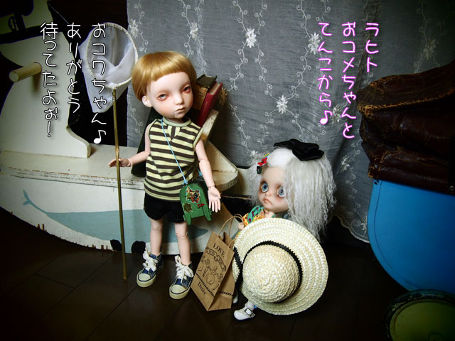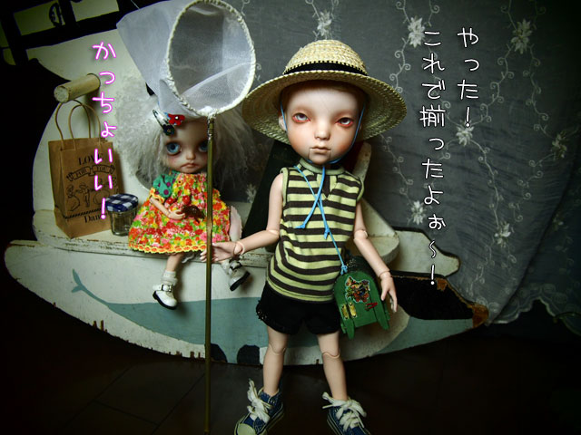 頼まれた、おコワ。 さっそく、ラヒトのもとを尋ねたようです。 おコワ「それと、おコメちゃんが、あれをお願い! って」 ラヒト「(*^-^)うん! 頑張ってみるって伝えておいて」 と、おコワはラヒトのもとを後にしました。 おコワが帰ったあとのラヒト。 めちゃんこ嬉しくて、ラヒトにしては珍しく はしゃいでみます。 嬉しい! そして、嬉しい! やっぱり、すごく、とても嬉しい! めちゃくちゃ嬉しい! ラヒトぉぉぉぉ!!! やっと、やっとこさ、捕虫網と虫カゴ、麦わら帽子 用意、できたよぉ〜〜〜〜!!!! で、麦わら帽子は、まあ、テキトーにカントリードールの帽子に リボンやらで、それらしくしたモノなんですが、 見た!? 見ました?! ご覧になったぁ〜!!!?? 捕虫網と虫カゴ! これは、Mが、お誕生日プレやら何やらかねて 製作してくれたものですのよぉ〜!!!! 軽い気持ちで、お願いしちゃったんだけど ものすごい、クオリティの高さに .+:。ヽ(*'0'*)ツ ワオォ!!びっくり! ラヒトのために、ちゃんと虫をあしらってくれた♪ 実際は、もちょっと深いグリーンなの。 ちゃんと、開くんだよぉ〜! なので、捕まえた虫が入れられる! 捕虫網も、めちゃんこすごい! M!!! ほんとに、ほんとに、m(*>▽<*)m アリガトッ ラヒト「Mりさん! もう、嬉しくて、嬉しくて! これから、昆虫採集に出かけるよ! 不思議な虫を捕まえたら、お裾分けするね! だって、虫仲間だもん! ほんとに、ありがとうございました<(_ _)>」 もぉ〜! やっと、ラヒトの夢を叶えてやることができて 嬉しいよぉ〜! M! アリガト━━゚.+:。d(≧ワ≦)b:.。.+.:━━ッ!! まだまだ、ラヒトの夏は終わらない! おコメちゃんにも、何か頼まれてるみたいだし! こうして、ラヒトは昆虫採集に出かけましたとさ。 (つづく) *******拍手コメへのお返事******* M*******様 ほんとに、「近い将来やってくる日」の事を 思うと、苦しくなりますが 「今」を大切にして、一杯、一杯、いっぱい 愛をそそいじゃいましょうね!!! でもって、はい! 元気の出る、カスタム、 がんばります♪ まだ、詳細は全然、決まってないんですが 素敵な子を生まれるように がんばります♪ PR