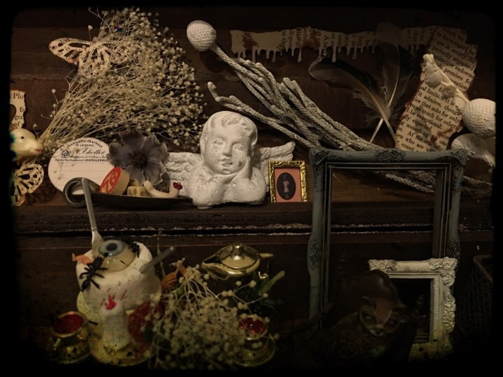 他が、フレンチシャビーを意識してるので ケーキはちょいとダーク要素を入れて♪ ってな具合で、もっと全体にダークに なりそうな所をグっとこらえて フレンチシャビーとゴシックホラーのあわいに 漂う空間に仕上げたつもり(〃∇〃) てれっ☆ 爪痕pupu (* ´>艸<)・:∴ 見えない誰かが。。ってな設定で♪ あ、そういえば魔術的っていうのも あるあるぅ〜! そういうふうに見ていただけて 嬉しい♪