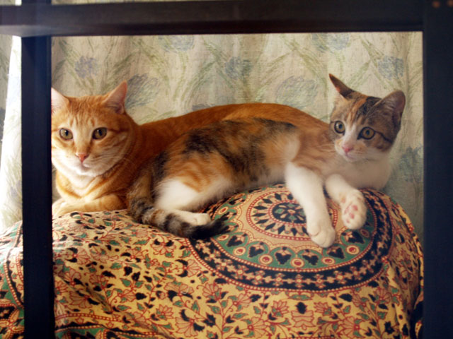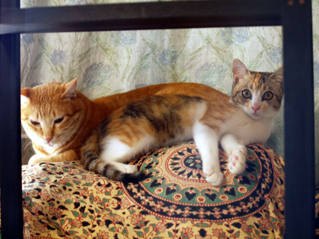 画像のように。 そして、 こんな光景も繰り広げられていた。 動画で「何が二人にあったんでしょうか」と言ってますが、旦那君が、「猫だんごぉ〜」と二人を強制的にベットへ運んで、仲良しさせたのが直接の原因か??? この時、初めてペロペロが始まったからねぇ〜。 で、この後、旦那君とひさびさに電車で外出。 稽古場で、私原作の芝居を工房の子たちが公演をするので、 目劇に。。。 自分の書いた芝居を観るというのは、完全な観客になれないので、手放しに楽しむっつーことはできないんだけど、若い子たちがそれなりにフレッシュに演じてくれていたので、大満足。 で、みゆとあじゅこ。 かなり長い時間、二人きりにしておいたので、ちょっと不安を感じながらも、帰宅してみると、我家はいたって平和。 相変わらず、仲良しな二人がお留守番をしておりました。 ああ、これで、みゆとあじゅこは大丈夫。。。。。 と思った矢先。 あじゅこがタンスの上に乗っていた。我家は、猫階段が作ってあって、タンスの上に自由に登れる。 みゆと二人でくつろいでいたので、まあ、こりゃ、二人の仲を邪魔しても悪いや、と旦那君と二人隣の部屋で世界陸上をみながら、晩酌をしていると。。。 突然。。。 「ドスン」と鈍い音が。。。 なぬ??? とかけつけると、下にあった籠が倒れていて、あじゅこはベットの下に。。。 そして、なんか様子がおかしい。 きっとタンスから落ちたのだ{{{{(;>_<)}}}} みゆに迫られて??? いや、でも、喧嘩してるような声も音もしないのに。。。 それから、あじゅこは、食べない、飲まない、出さない、みゆを異常におびえる、抱き上げるとギャーギャー泣く。。。。 状態に入ってしまった。 せっかく、せっかく、あんなに仲良くなっていたのに。。。 みゆと一緒にいたことによって、タンスから落ちたショックがみゆを怯えるという事とセットになってしまったらしい。 外傷チェックなどをしようと、隣の部屋とドアを閉めて、あじゅこのチェックをする。 ちゃんと歩くし、骨とかに異常はないみたいだが、外でみゆの気配がすると、すごく怯える。 それと、食べないし、抱き上げた時に、ギャーギャーいうので、内臓???? という不安もあって、獣医さんの所へ行く。 獣医さんの所では、ご飯をチョビっと食べる。 しかし、昨日の今日なので、症状ができっていない場合もあるし、今週避妊手術をする予定でもあったので、そのまま、病院にお泊まりをして、様子を見てもらい、大丈夫なら、そのまま避妊手術を受けるという事に決定。 ヌゥ。。。 ま、このまま、また恐怖の館へ帰ってもストレスがたまるだけなので、そのほうが良いかなと。。。。 避妊手術。月齢としてはちょっと早い気もするけれど、と先生がおっしゃったけど、ま、なりゆきじゃ。。。。って事で。。 今後の展開はどうなるのか???? 果たして、我家に、2人の猫との平和な暮らしはやってくるのか????? 乞うご期待って事で。。。。 ふぅ。どうなるんだろ。。。σ(^_^;) PR |