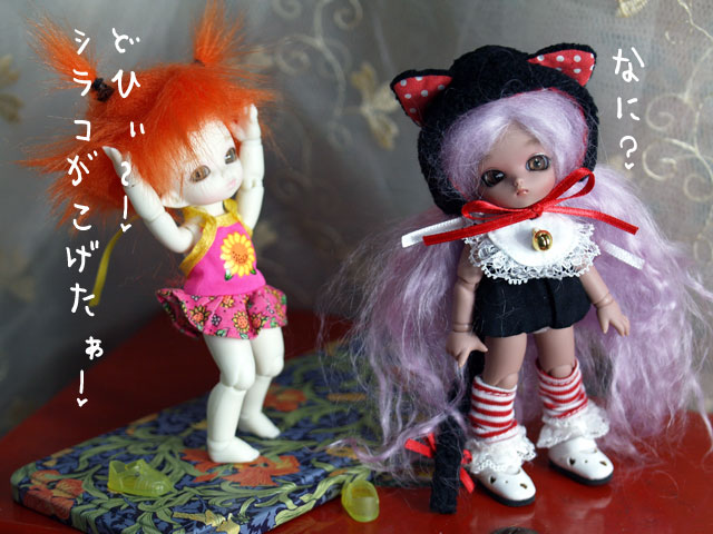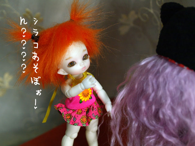 これも、林檎ちゃんが あの時、タクシーの中で 「老後の楽しみ。。。うんぬん」ってな事を言ってくれて ほんとに、決断して良かったとオモォーウヾ(@⌒▽⌒@)ノ 下がり眉だからシラコよりオトナシってな感じ あるいは、天然さん。。。みたいなさ。。。(笑) 多分、オトナシさんに見えるのは、 そうそう、到着したばかりだからよん。。。 このウィッグ。ポケフェのために買ったんだけど、 なんだかちょっと小さくて使えねぇ〜ってな。 それが、pukiにはちょっと大きいけど、 結構、イケる???みたいな。 デフォの羊毛ウィッグ(あ、これがちゃんと附属してくるとは思わなかった) だと、アクロバットとかしにくいから 日常ウィッグを決めてやらなくちゃだわ(;´▽`A`` すっとんで来てくれてありがとぉぉ♪