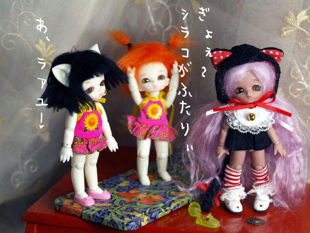 やっぱさぁ〜、2人より3人、3人より4人だよねぇ〜!! え?!Σ(◎o◎;) 4人?? (*v.v)ハズイ...もう一人ね、焦げっこがくる予定。。。 上半期オーダーだったから(笑) 焦げっこは、フルセットでお迎えしたから、 色々附属しててゴージャス。 シラタラは身一つでお迎えだったからさ、なんか、不憫な格好してるよね。。 いつも(苦笑) (゜-゜)(。_。)ウン でも、そうそう、賑やかだからいいのだぁ〜!!
