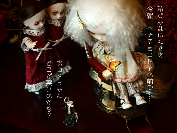 リースのコメに 「こんなの貰える人は幸せだねえ~」と つぶやいてたら! 私、幸せな人になっちゃったぁ~~!!! +:。ヾ(o・ω・)ノ゜.+ ピンポーンってお届けモノで「私、何か買ったかな?(?ω?)」 と開けてみると! (*´∀`*)ステキ♪なリースぅぅぅぅぅ。 感激ダス! で、ちょいとこの前西荻で買ったヴィンテージの オーナメントとカラスを加えて (〃ノωノ)キャッ!!! ものすごくゴージャスで 大満足ぅぅ!! rちゃん、m(*>▽<*)m アリガトッ これから毎年、使わせていただきます(o*。_。)oペコッ 幸せなクリスマスになりそうだわん♡ で、この前のJサンタさん椅子のおコメちゃんストーリーの つづき!!! おコメちゃんが、ヘナチョコドアの下で ふと下を見ると…… と、おコメちゃんは、それを拾ってみたのでありました。 で、とりあえず、ヘアアクセにしてみたのですが…… あまりにもうるさいので 食べちゃうことにしちゃいました。 が、しかし、食べようにもあまりにもうるさいので それで と、二時間後…… ボムッ!! ボムッ!!! てなことで、シカミちゃん。 西荻で買ったストラップなんだけど あまりにもよくできていて、頭だけにしておくのは 勿体ないと、ボディを付けてみたの。 (*´艸`) ムフ♪ なんか、二人はイイ感じにお友達に なれそうだよねん。 喧嘩するほど仲がいいみたいな関係にさ ̄∀ ̄* ニヤッ で、昨日は、なんか、頂きモノdayだったみたいで。 美味しいお餅とか、チャングンソクのファンクラブでしか 手に入らないDVDとか、頂いちゃった(*´艸`) ムフ♪ みなさん、ほんとにありがとぉぉぉぉ!!! ・+:.'゚チュゥ─ヽ(*´・3ε・`*)ノ ─ッ♪.: *: PR |