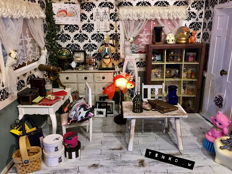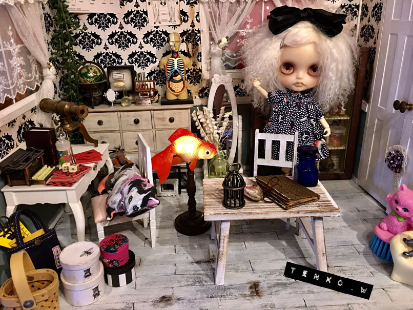 おコメ「皆様、こんにちはだわさ。 来月のてんこの「TENKOTEN」に私のこの部屋、売り物件として 出品する事にしただわさ! ちょいとマニアックな部屋だけど、私はけっこう気に入ってたから 新しいおうちで、誰かがこの部屋に住んでくれるといいだわさ。 まあ、ちょいとダメもとなお値段をてんこが付けるらしいので また戻ってくるかもだけどねゞ(≧ε≦o)ぷぷっ!!」 ってなわけで、来月の個展に 展示だけにしようと思っていた おコメハウス。 お値段を付けて 販売する事にしました。 ほとんど↑の現状維持という事で (センターのテーブル、もう少し白くするかもですが、 あとはこのまま) 中の人体解剖模型とか、天体望遠鏡とか 試験管とか、おコメちゃんの 愛用品もそのまま♪ 新しく、金魚ルームライトが加わわって、 おコメ「なかなか住み心地の良いハウスなので 見にくるだけでも見に来て欲しいだわさ! あ、ただし私は付属しませんのでご了承くださいだわさ!!」 個展準備も佳境に入ってきて 自室はもう、何が何やらな状態です<(;~▽~) PR